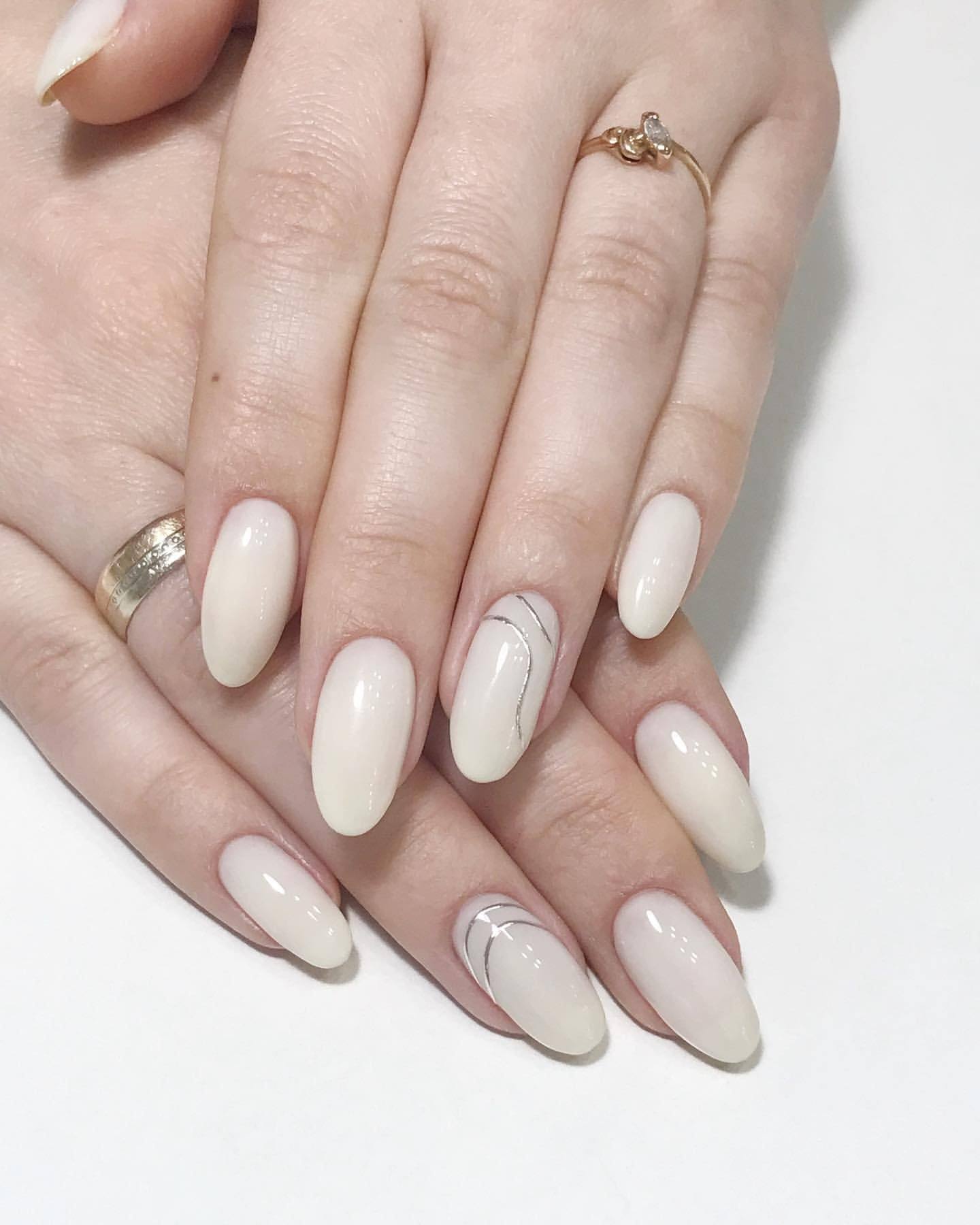Молочный цвет в маникюре шикарно и эффектно смотрится на загорелых руках. Стоит помнить, если у вас бледная кожа рук, то молочный цвет ноготков может сделать её ещё светлее. В таком случае есть решение – с таким маникюром хорошо будет смотреться ваш наряд в кремовых оттенках. Любите элегантный стиль – носите белую одежду