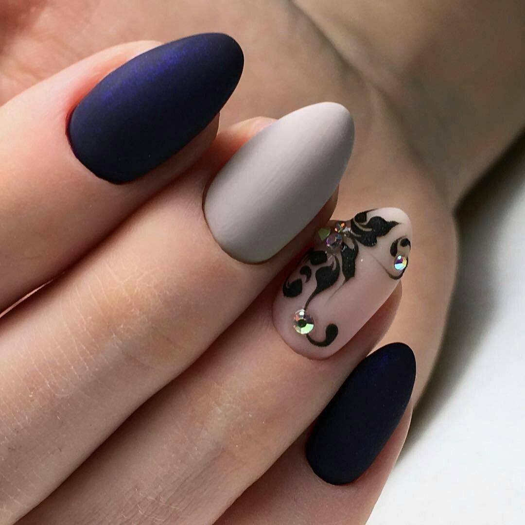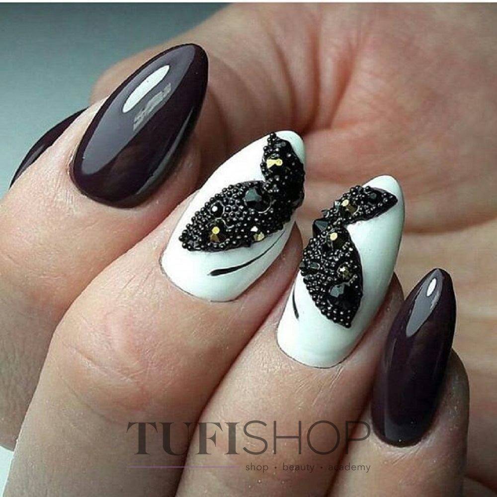 Стразы могут также контрастировать с темным покрытием ноготков, дополняя бусины, кружевные узоры золотом, очаровательную точечную роспись.
