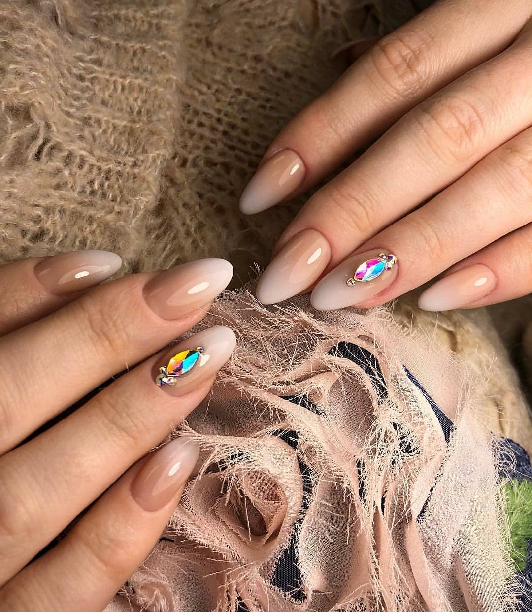 Отлично подходят для этого стразы разных размеров и форм. Тем более, что можно разместить их совершенно по-разному. Причем речь идет не о привычных крупных композициях, а о более лаконичном оформлении. К примеру, декор прикорневой зоны отлично смотрится в повседневной жизни. Ведь такой маникюр идеально подходит даже для работы в офисе. Более ярко будет смотреться полоска на одном ноготке из страз. Ну и конечно же, всегда можно интересно оформить ноготки, делая хаотичное размещение декоративных деталей.
