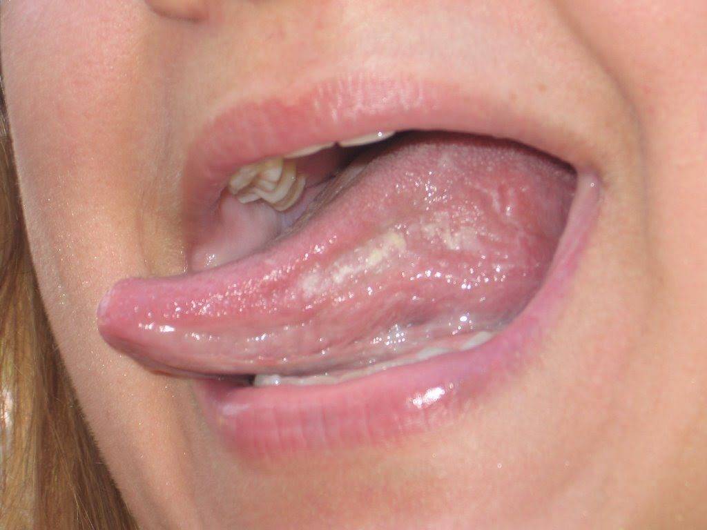 Десквамативная стадия развития микоза характеризуется поражение языка. На нем обнаруживаются плоские уплотнения и плотный белый налет. Этот налет достаточно сложно снимается ватной палочкой и быстро образуется повторно.