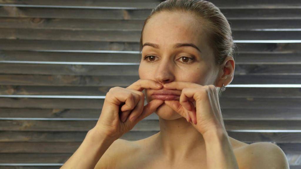 Массаж мышц у рта осуществляется методом надавливания на зону над верхней губой, направляясь к уголкам рта. Потом следует помассировать точку, которая расположена в центре, непосредственно под нижней губой