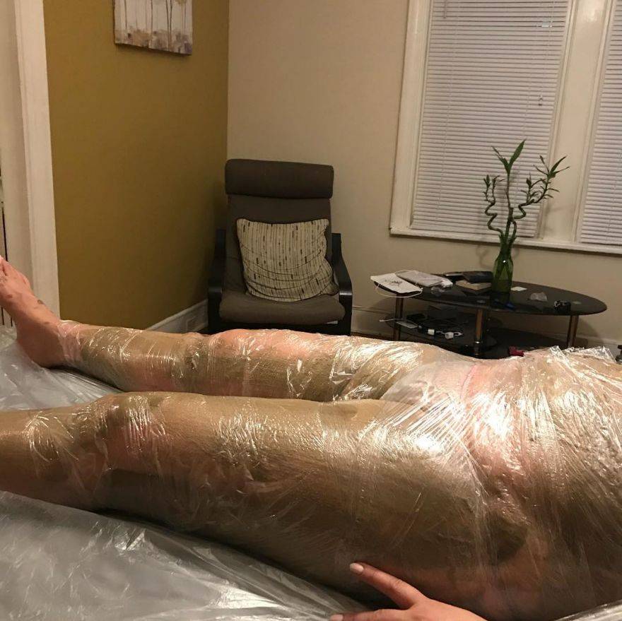 - теперь завернитесь в пищевую пленку и укутайтесь одеялом, если вы хотите совместить процедуру с отдыхом. Можно тепло одеться и заняться домашними делами – это нисколько не повредит.