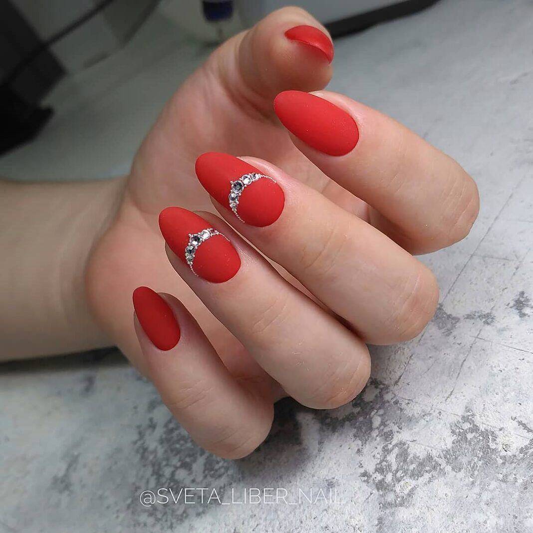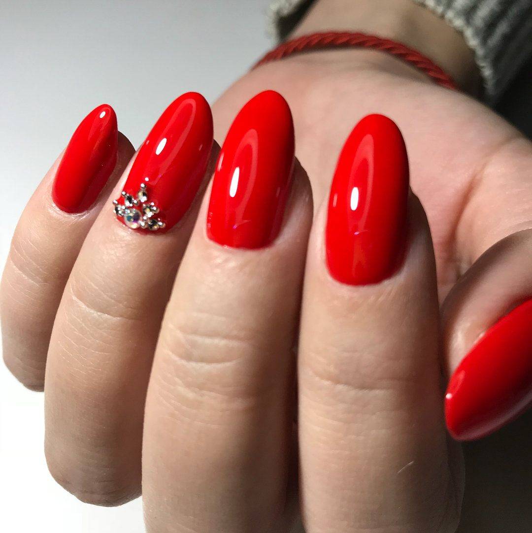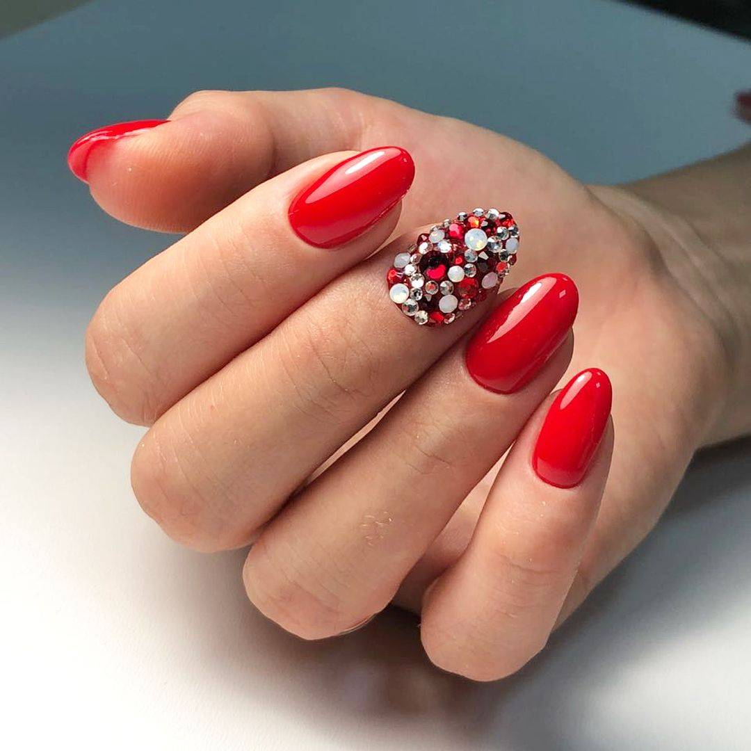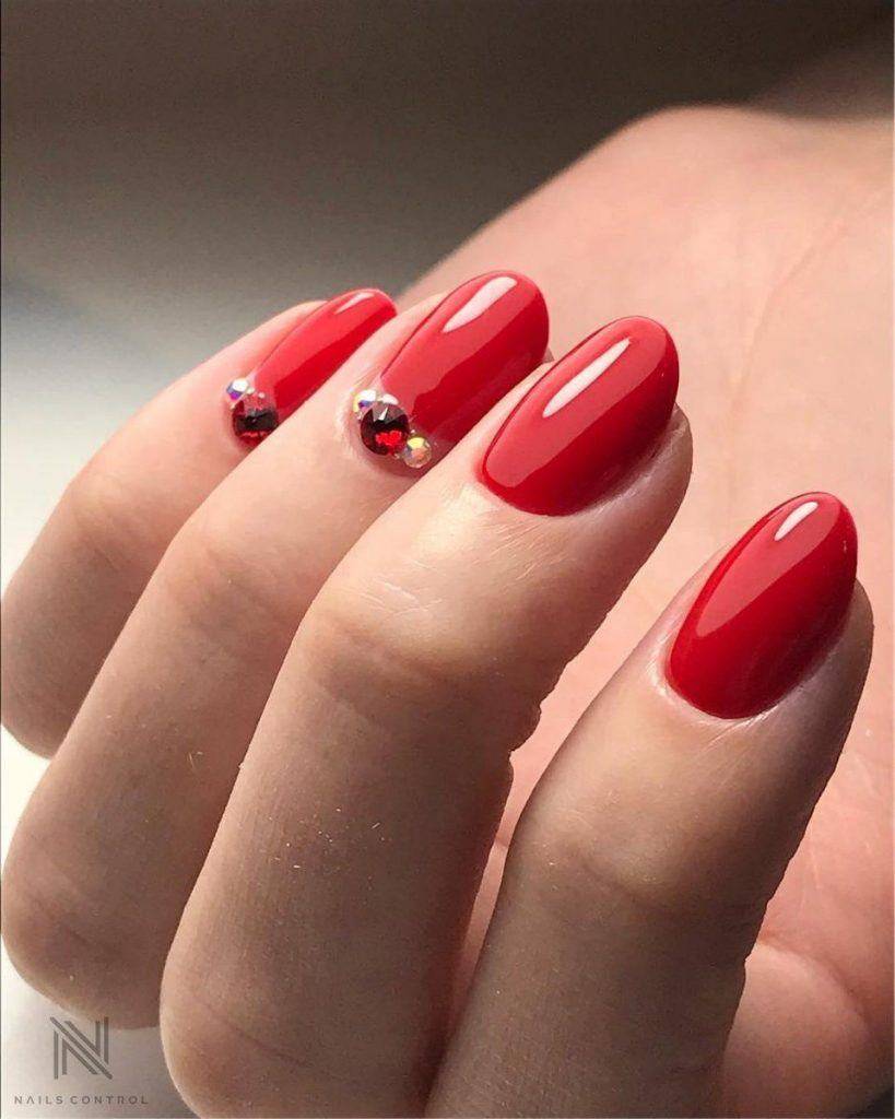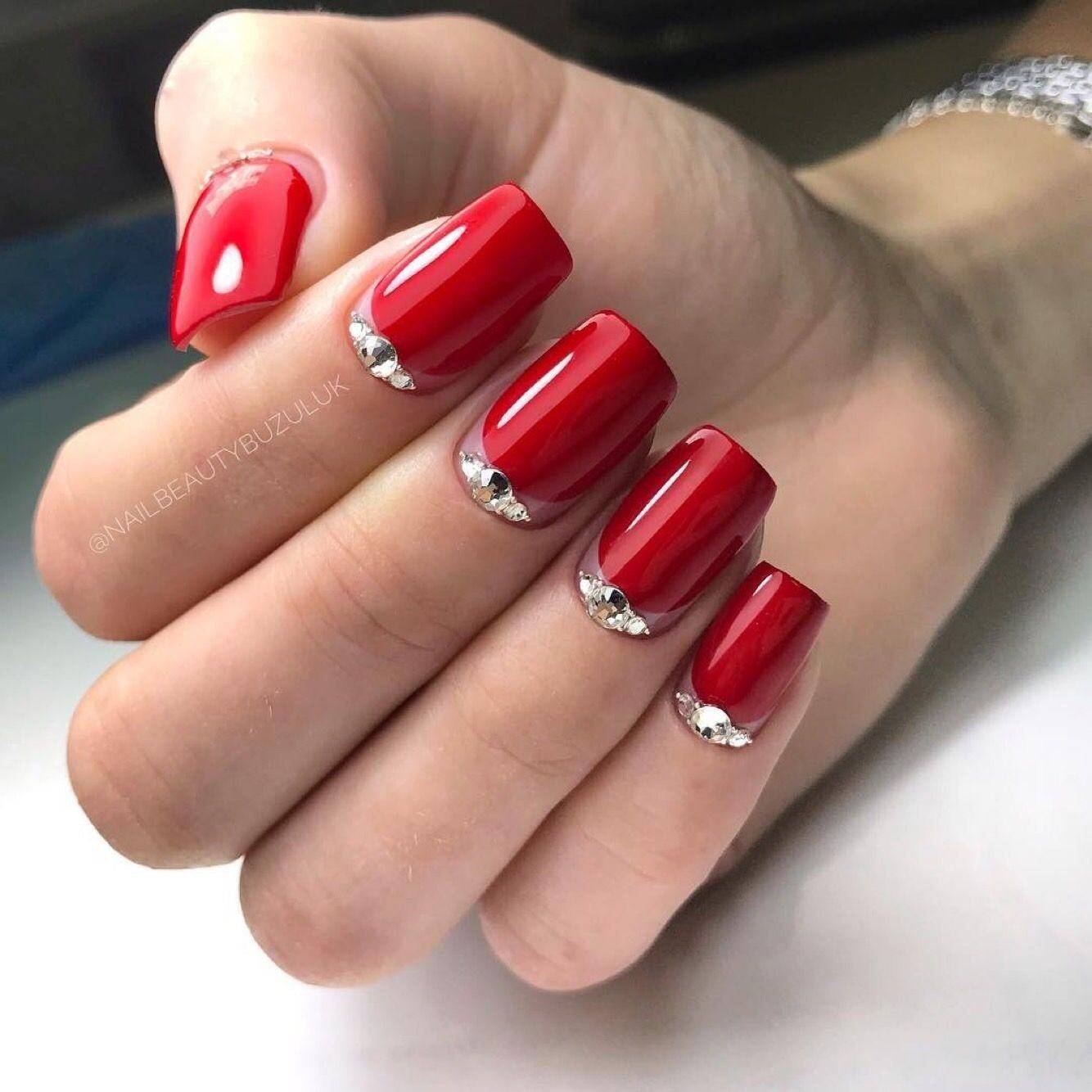 #1 Однотонный красный маникюр со стразами 2020