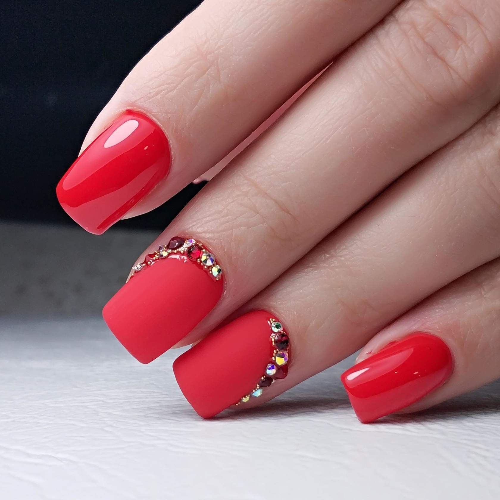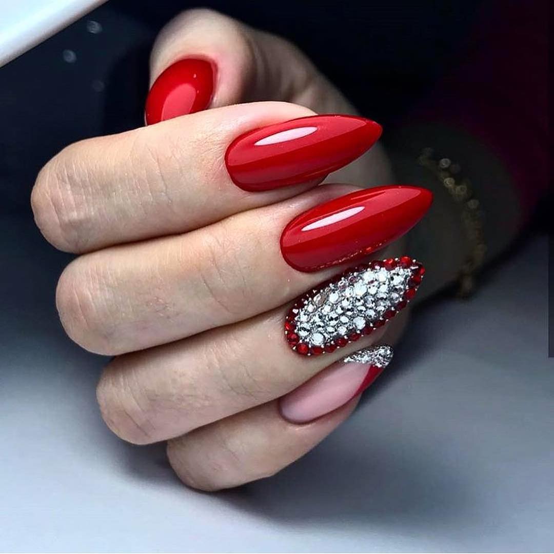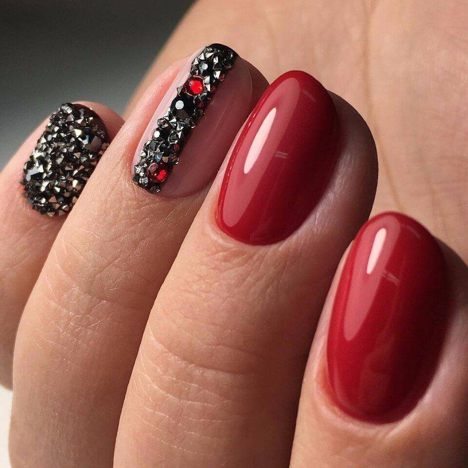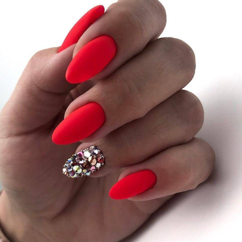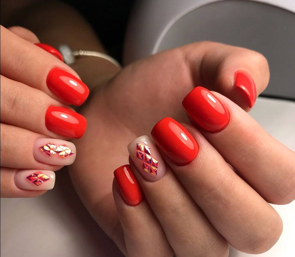 #1 Однотонный красный маникюр со стразами 2020