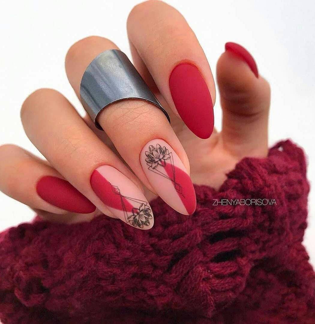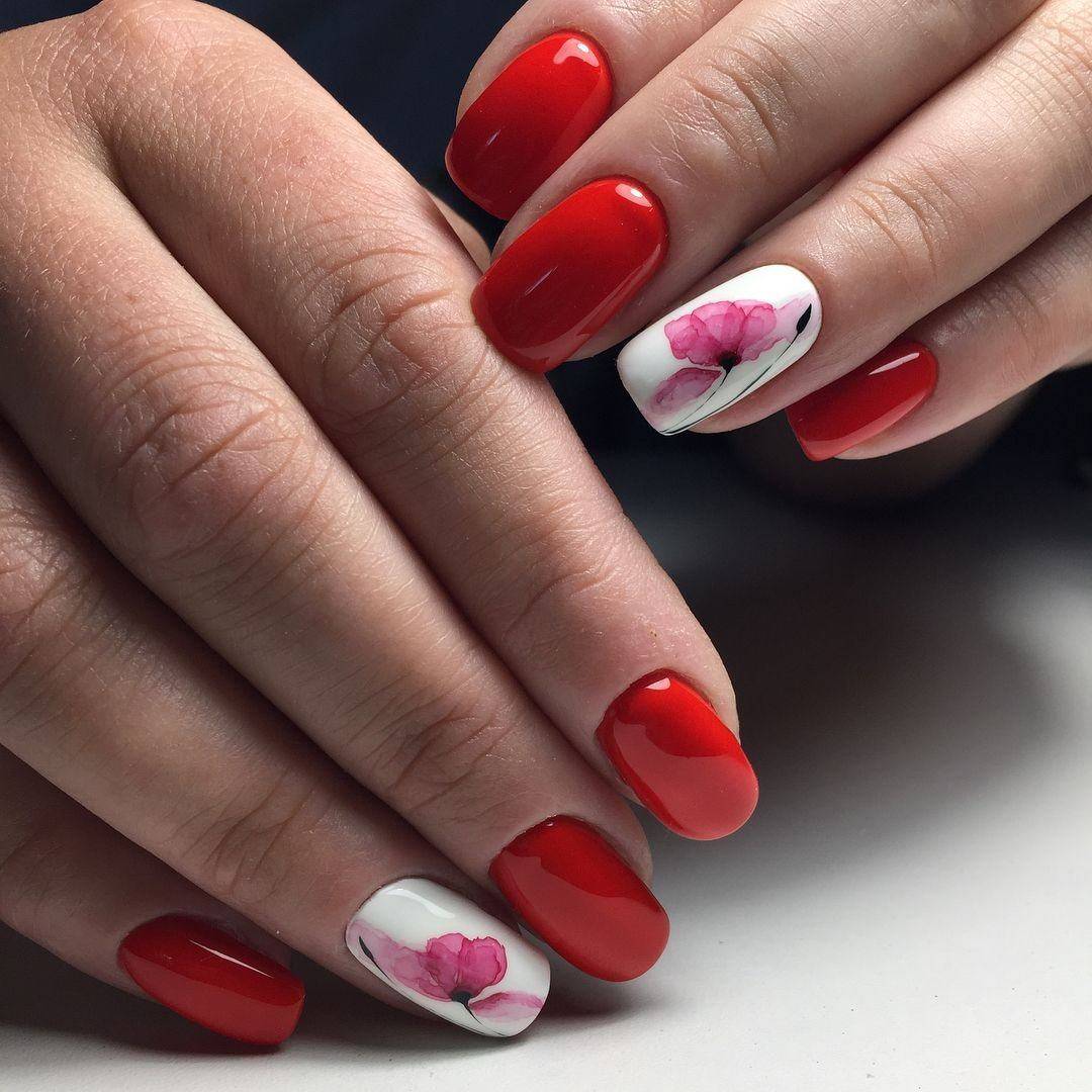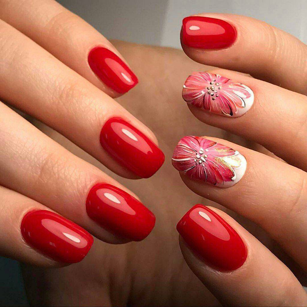 #4 Красный маникюр с флористикой 2020