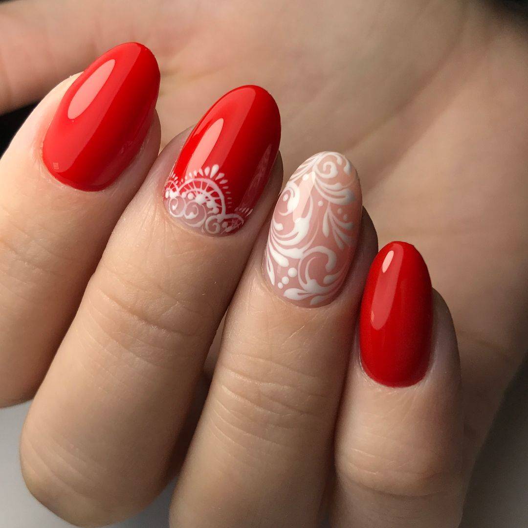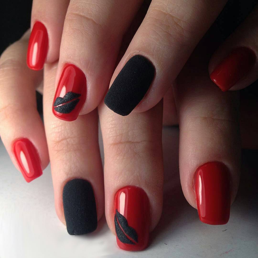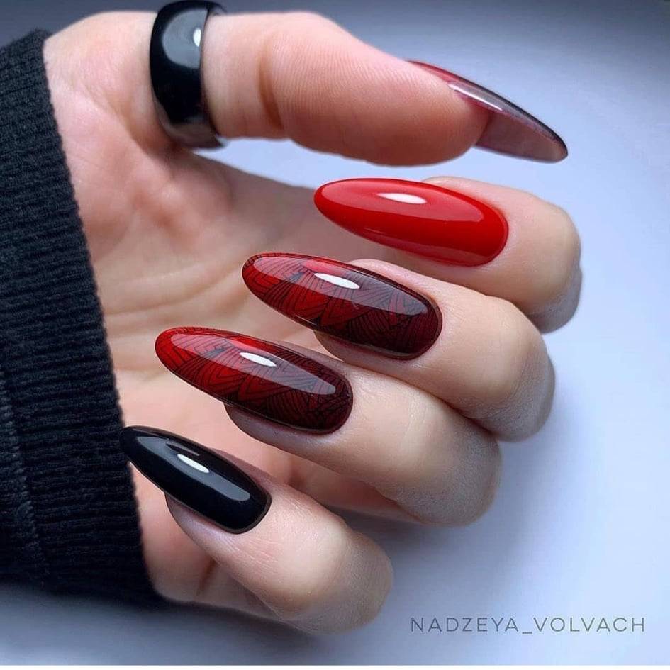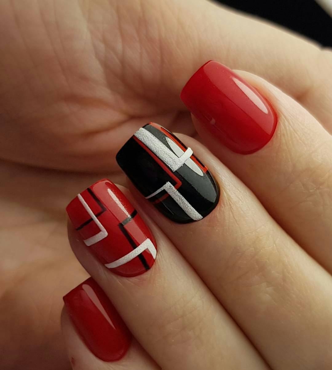 Самые удачные варианты дизайна ногтей получаются при комбинировании красного лака с черным. Красиво смотрится алый цвет в сочетании с белым тоном. Такие тандемы особенно успешно используются в дизайне с цветами или геометрическими фигурами.