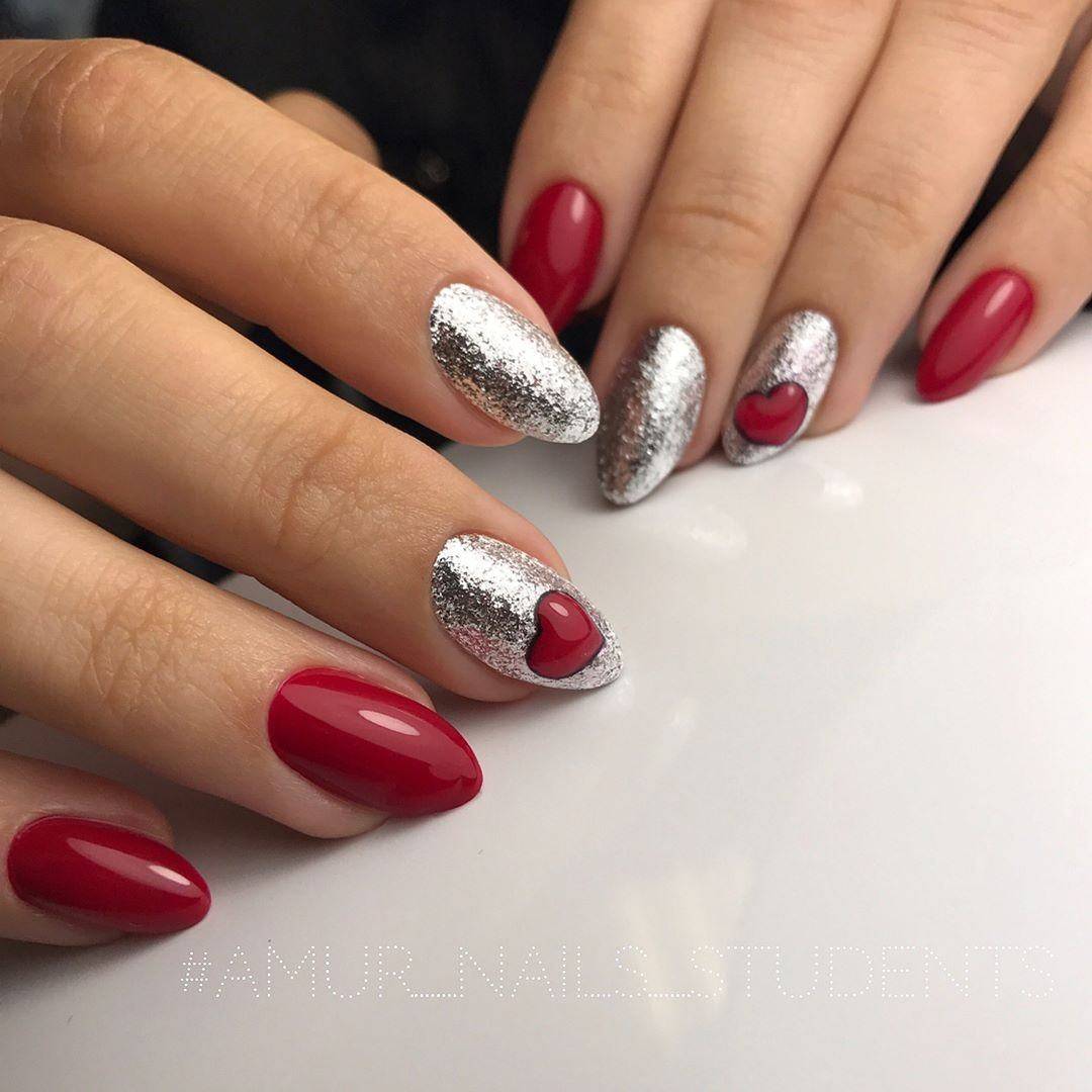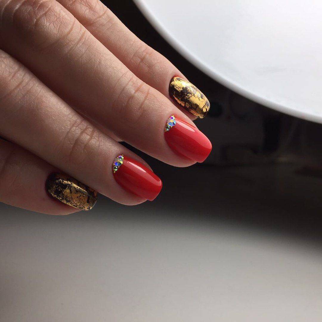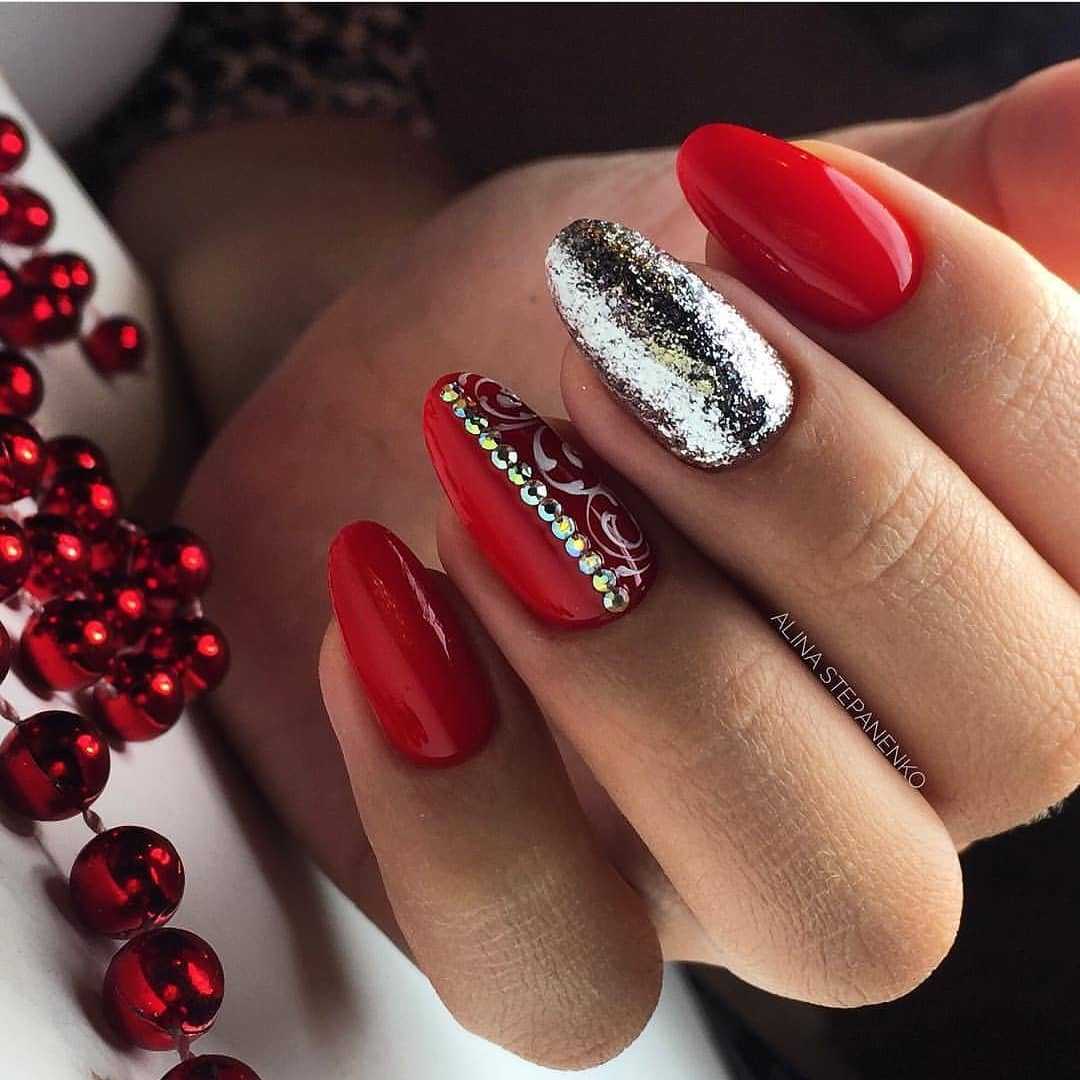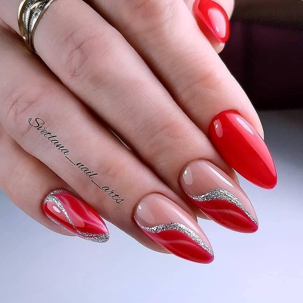Можно также совмещать красное покрытие с золотом или глиттером. Отлично смотрится алый маникюр с серебром на одном пальце.