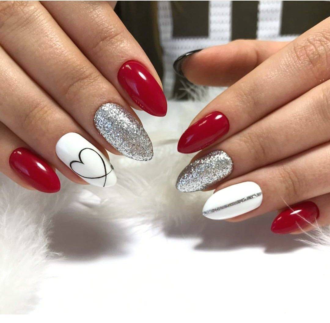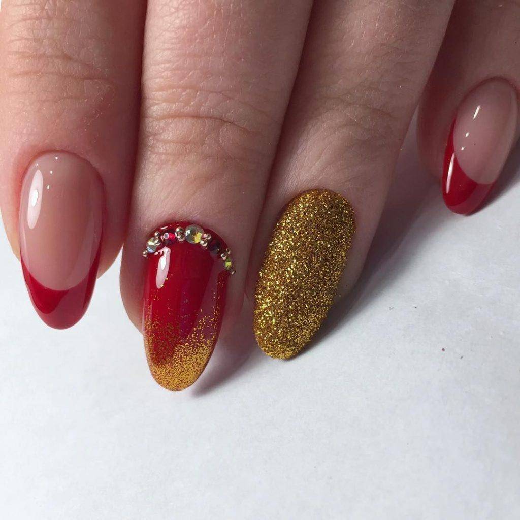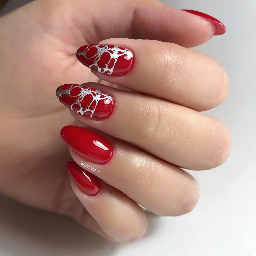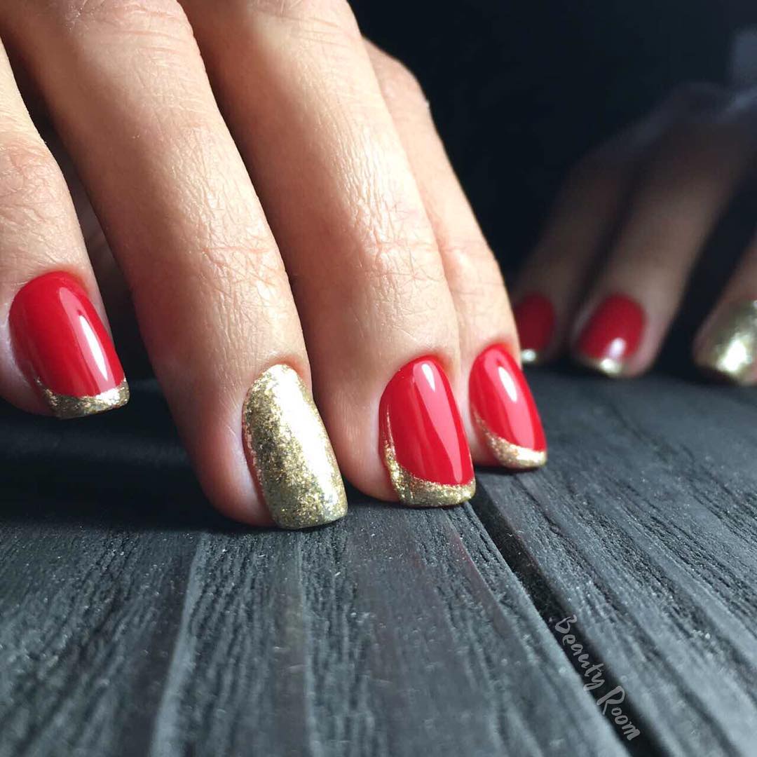 Можно также совмещать красное покрытие с золотом или глиттером. Отлично смотрится алый маникюр с серебром на одном пальце.