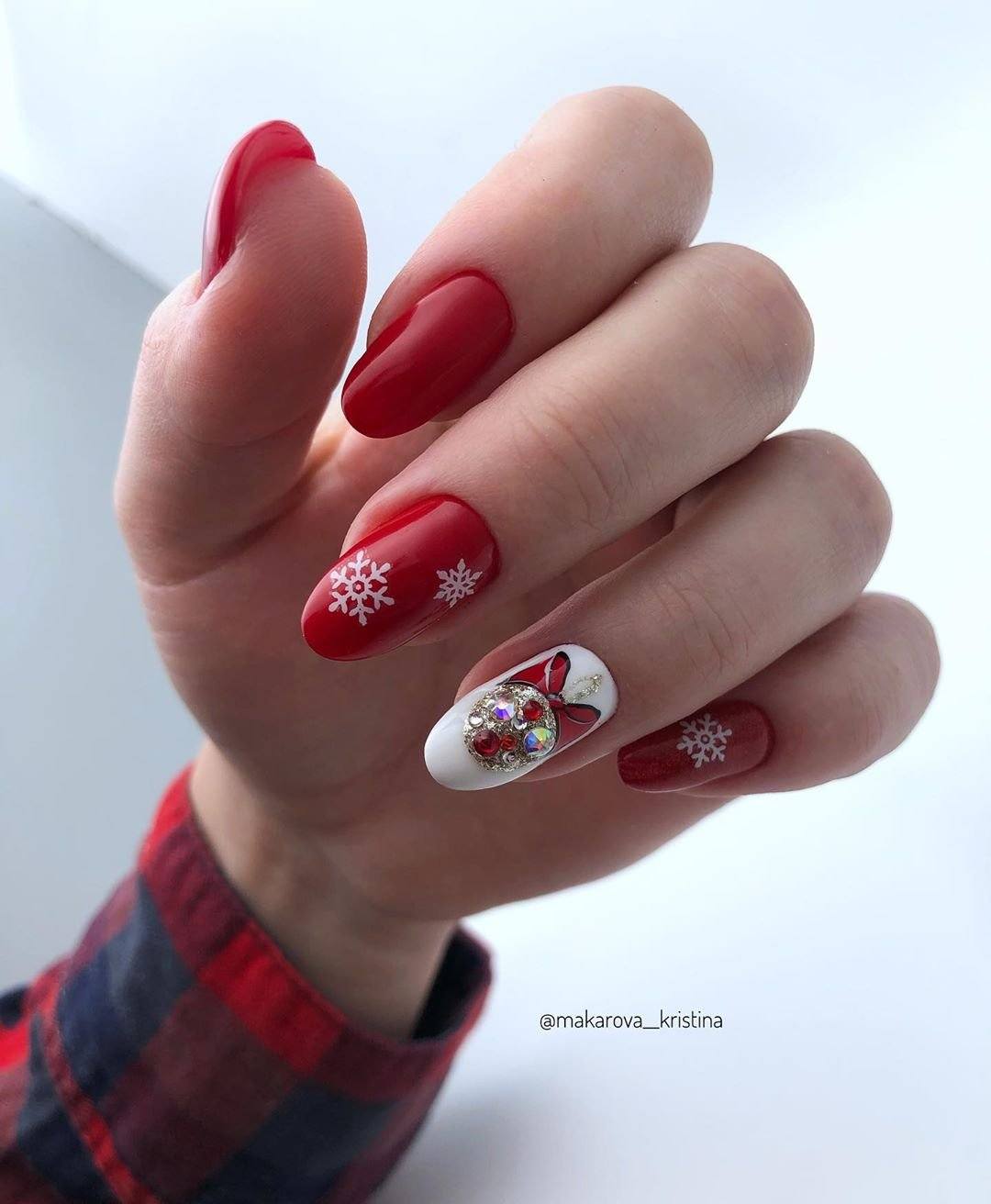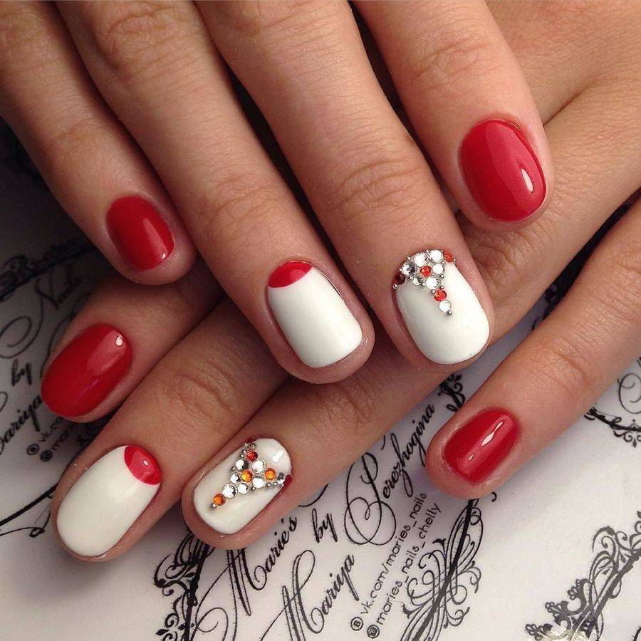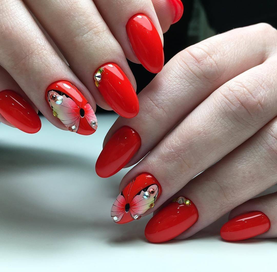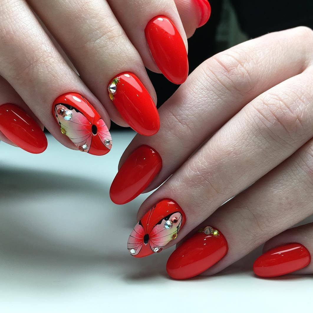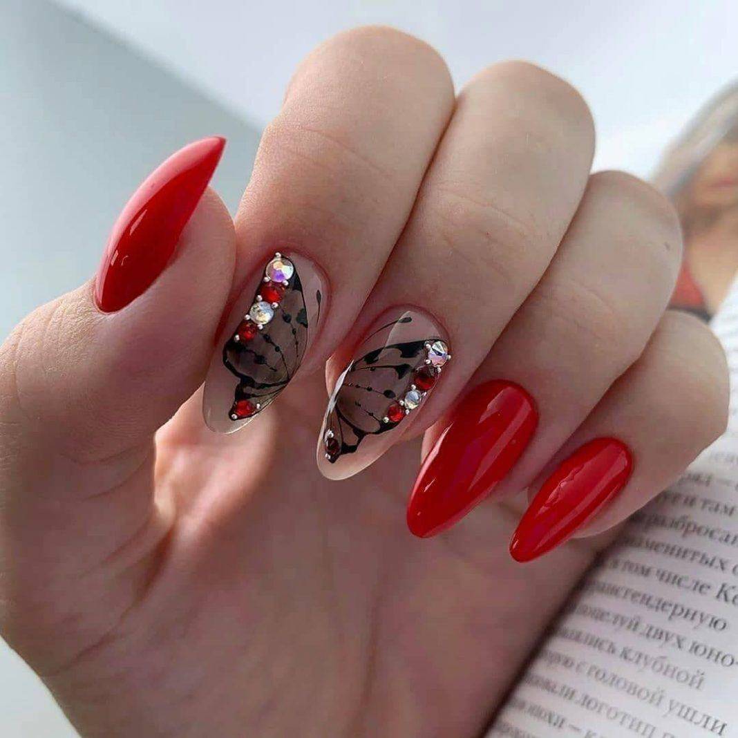 Красные ногти 2021-2022 с дизайном: варианты рисунков, декора со стразами