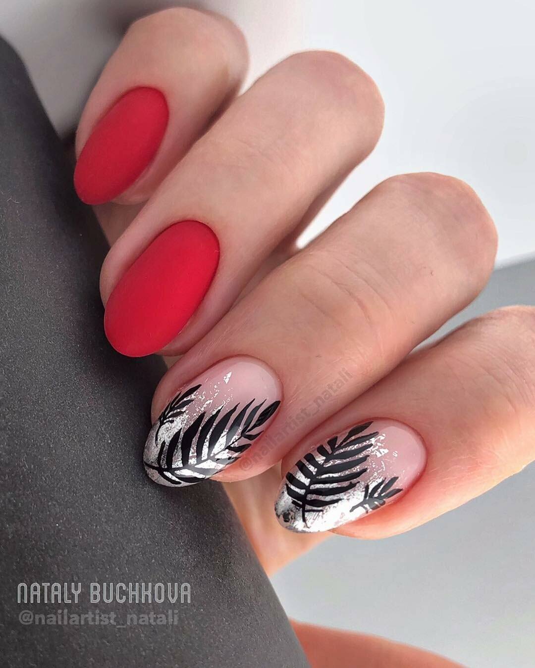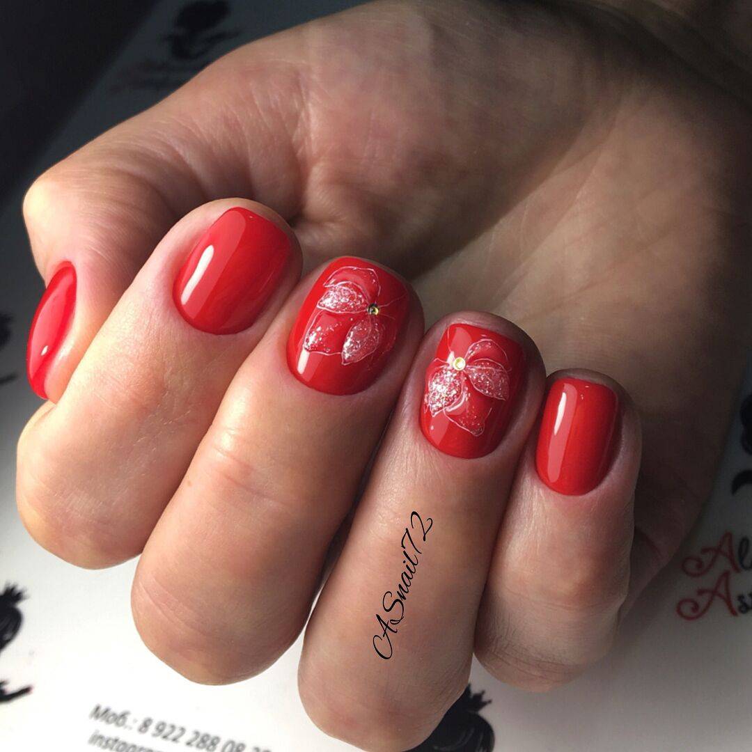 Красный маникюр на коротких ногтях практически ничем не отличается от нейл-артов, выполненных на «длине». Исключение составляют только узоры, они должны быть крупнее, без мелких деталей. На коротких ногтях отлично смотрятся нейл-арты с флористикой, с серебром, с геометрией.