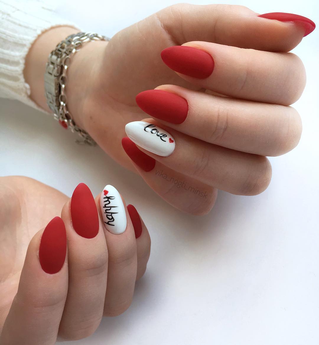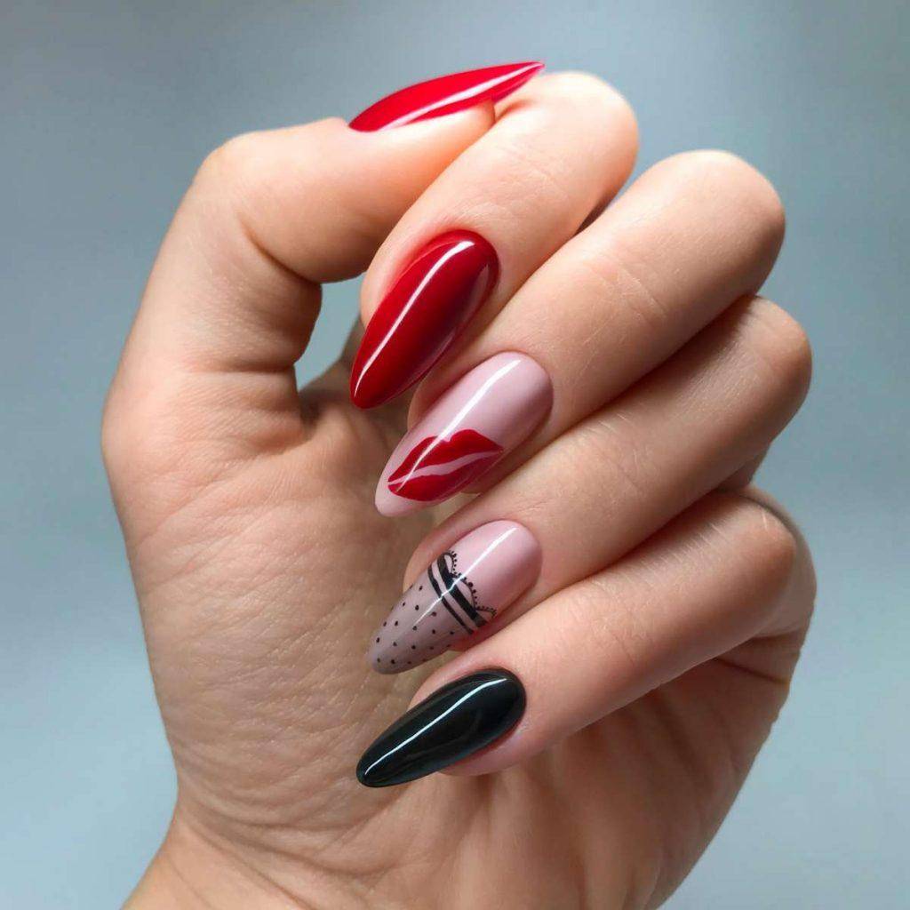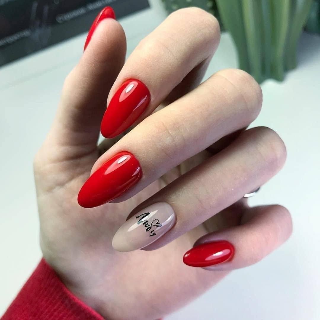 Очень нежно и женственно смотрится маникюр с пайетками, со стразами и слайдерами. Что касается формы ногтей, то с красным цветом шикарно выглядит квадрат и овал. На квадратных ногтях можно выполнить красный дизайн с белым и черным гель-лаком, со слайдерами и надписями.