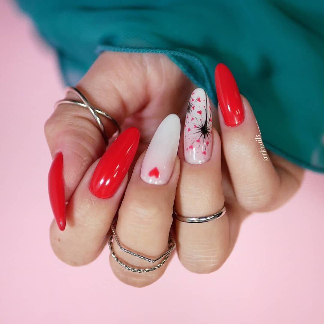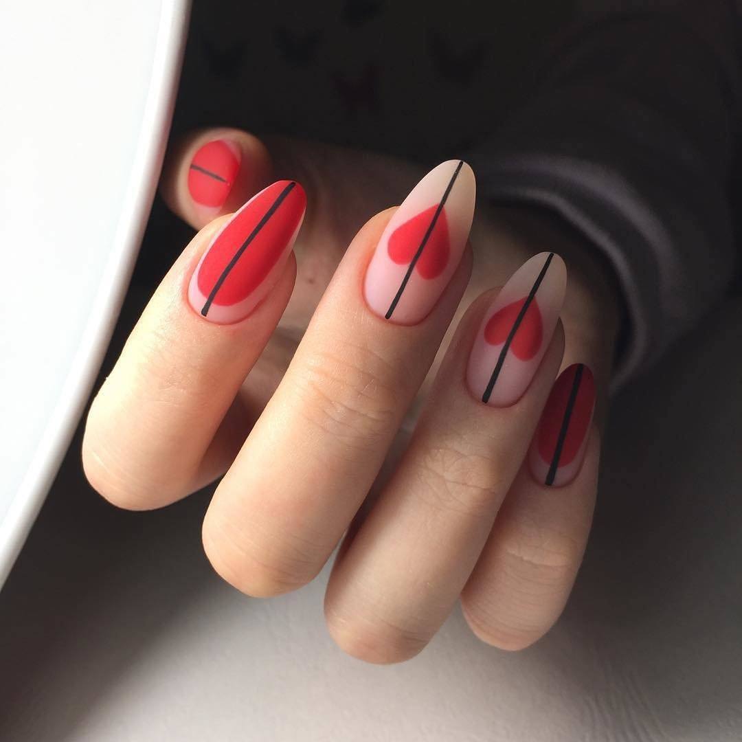 Для создания нежного нейл-арта можно сочетать красный цвет с нюдовыми или пудровыми оттенками. Отлично гармонирует красный тон с песчаным, пыльно-розовым, бледно-голубым.