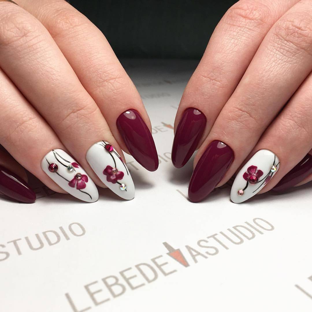 Присмотритесь к маникюру с темными веточками, стразами, узорами стемпингом. Располагайте узоры на 1-2 пальцах руки, остальные ноготки лучше окрасить в однотонный красный цвет. Самый популярный цветок в красном маникюре – это, без сомнения, роза. Это по-настоящему благородный узор, который шикарно выглядит именно в красном цвете. Если вы решили выполнить маникюр с розами, то располагайте узор на безымянном пальце.