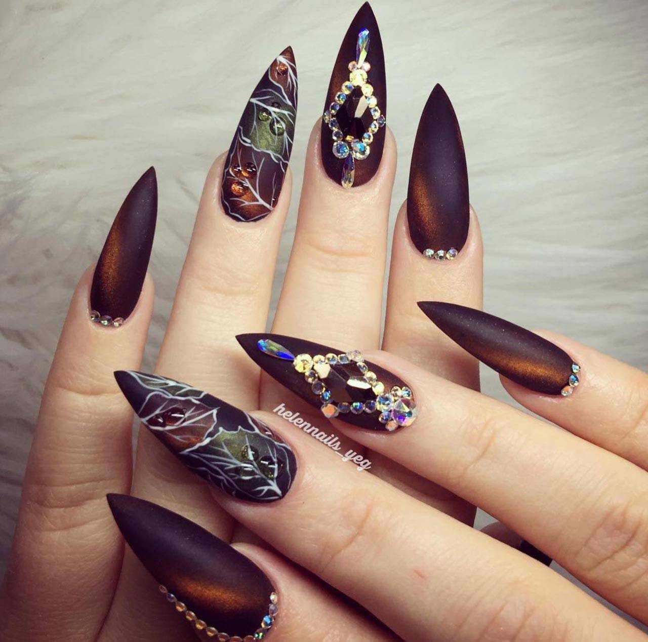 Для осеннего периода важно выбрать себе тот дизайн острого маникюра, который бы отвечал не только модным тенденциям и не только в формах и дизайне, но и в соответствующем цвете, расцветках и оттенках подобранного декора, рисунках и его оформлении стразами, что немаловажно