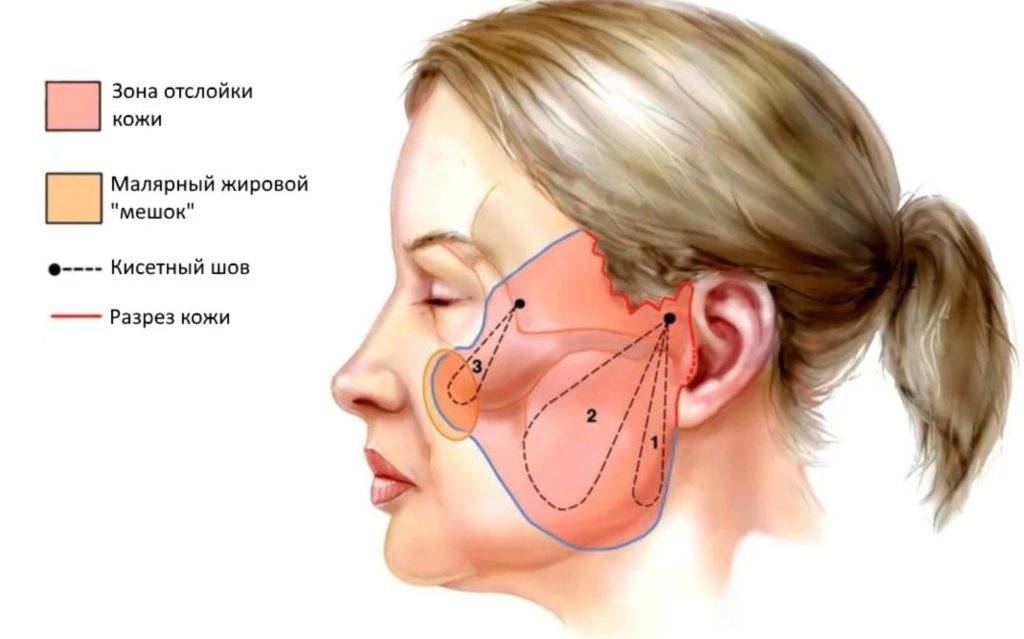 Операционный способ, как упоминалось ранее, проводится посредством разрезов в волосяной зоне либо подбородочной и последующей подтяжки кожи.