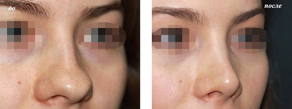 Безоперационная ринопластика методикой введения филлера может проводиться при горбинке, уплощении переносицы, опущенном или слишком приподнятом кончике, а также на седловидном носу. Эффект от такой коррекции держится от полугода до года, однако период рассасывания препарата очень индивидуален.