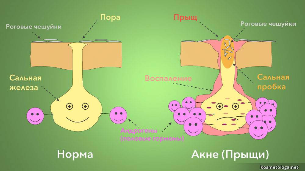 - Повышенная выработка определенных половых гормонов, особенно в период полового созревания. Это вызывает избыточную секрецию кожного сала и повышение его вязкости.