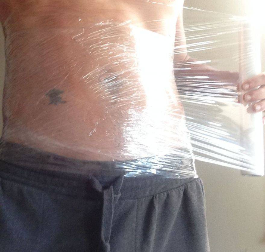 - Теперь необходимо замотать себя плёнкой, таким образом, чтобы она плотно прилегала, но при этом ни где не пережимала;