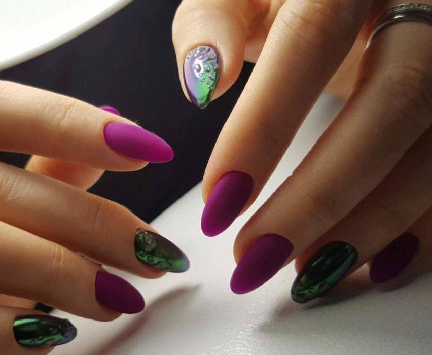 Фиолетовый маникюр гармонично сочетает в себе все достоинства синего и красного дизайна и металлический перелив. Этот цвет хорош сам по себе и не нуждается в дополнительных украшениях. Однако если очень сильно хочется, то можно поэкспериментировать.