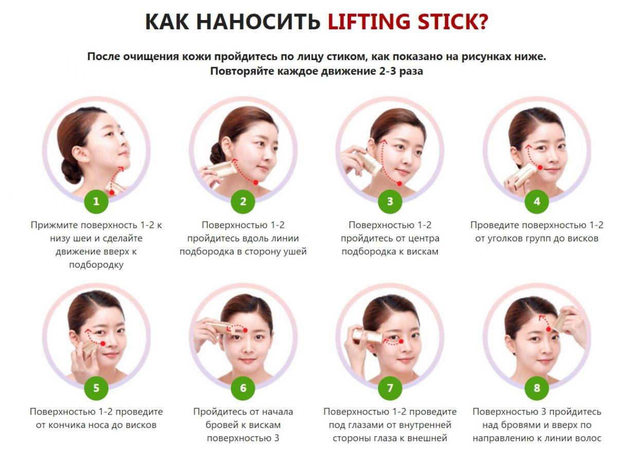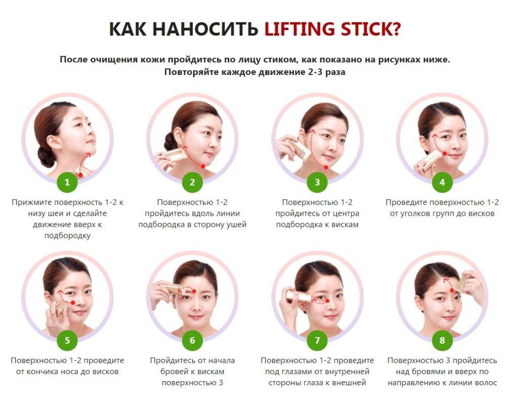 Lifting Stick имеет особую форму, повторяющую контуры лица. Она состоит из четырёх пронумерованных сторон. В каждую упаковку вложена подробная инструкция, как и какими сторонами правильно наносить состав. До начала использования очистите кожу. При массаже соблюдайте последовательность действий: