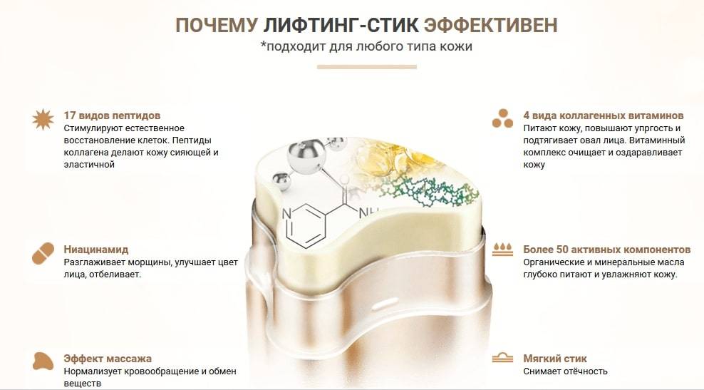 Лифтинг-стик содержит пептиды. Они способствуют приостановлению процесса старения. Молекулы пептидов отличаются малым размером, что позволяет им с лёгкостью проникать через эпидермальный барьер. Они стимулируют процесс обновления клеток.