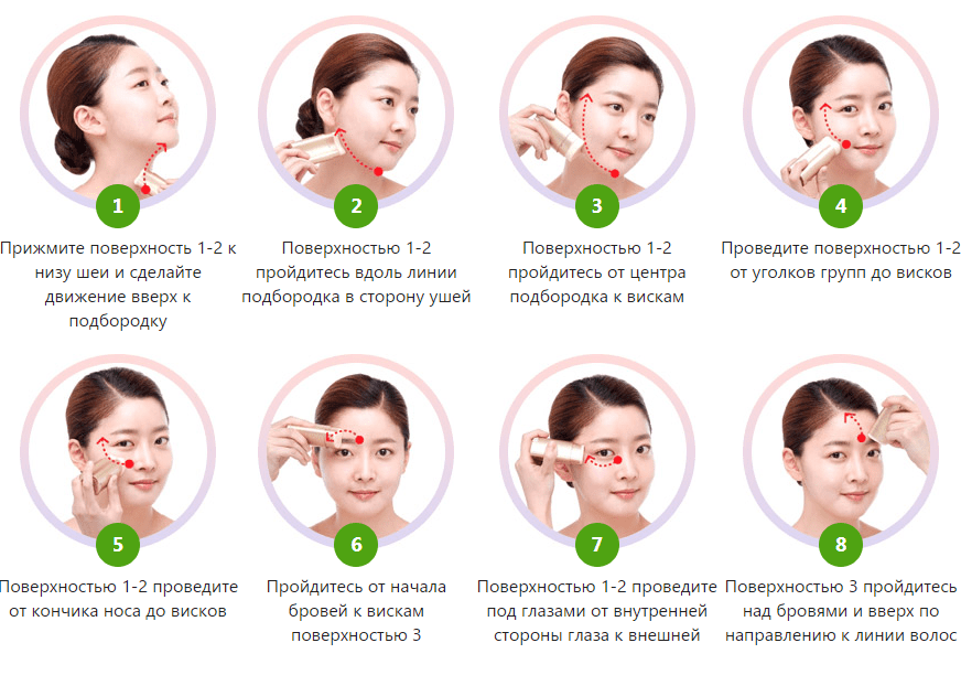 Переходите от подбородка к ушам с обеих сторон лица: это позволит избавиться от возрастного провисания, скорректировать овал лица, сделав его более четким;