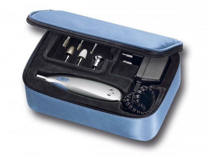 Компактный и удобный в использовании фрезер немецкого производства. Аппарат работает от аккумулятора, который заряжается от сети (для полной зарядки необходимо 16 часов). Мощность прибора составляет 13 Вт, при этом он может создавать вращение до 11 тыс. оборотов/мин. Стоит отметить, что прибор может работать и с меньшими оборотами (7 тыс.), для переключения между скоростями предусмотрен регулятор. Небольшой и легкий (вес 161 г) инструмент можно использовать для педикюра, маникюра, ногтевого дизайна. В комплект входит 5 насадок: 2 каменные и 3 сапфировые, которые отличаются стойкостью к износу и долговечностью при правильном использовании.
