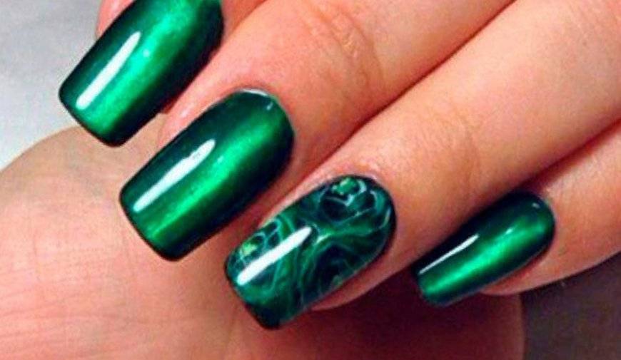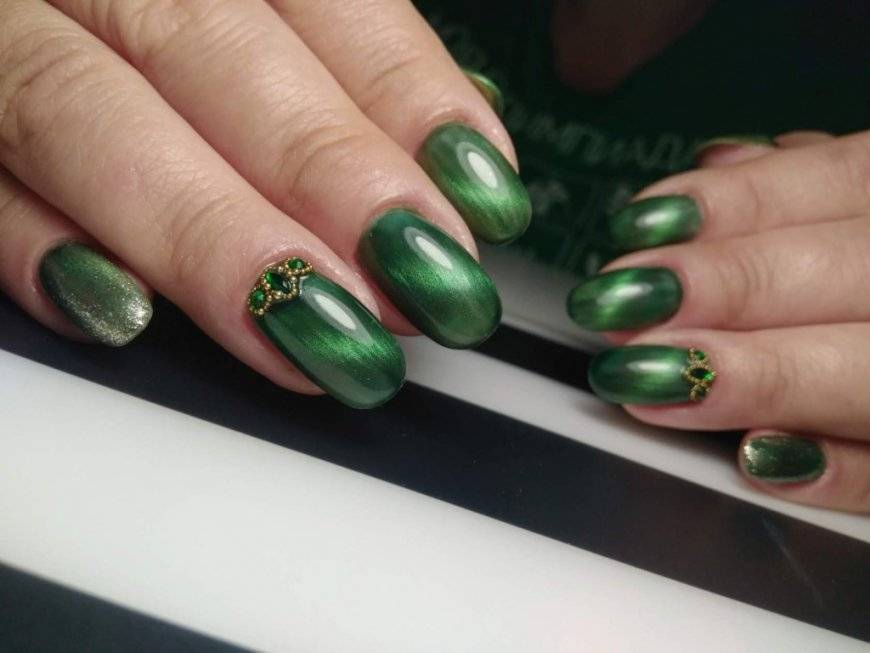 Сначала ноготки покрывают основой (базой) для гель-лака, которую просушивают в ультрафиолетовой лампе. Затем наносят зеленый гель-лак, который тоже сушат. Магнит подносить сразу не нужно. В видео мастер этот момент описывает. На фото показан прекрасный, глубокий изумрудный оттенок, который очень похож на кошачий глаз.