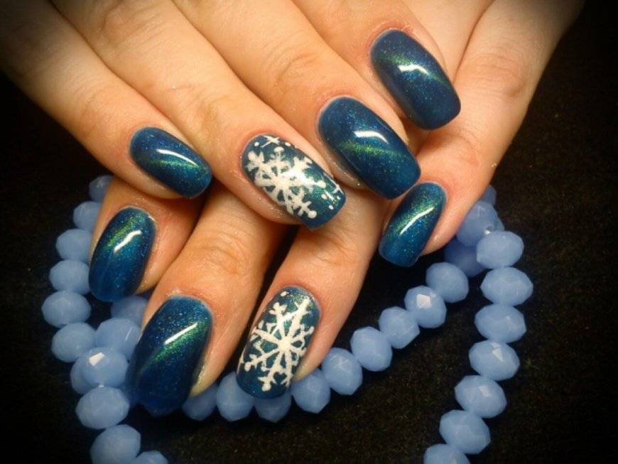 Можно комбинировать с кошачьим глазом художественную роспись. На синей поверхности ноготка красиво выглядят бархатные орнаменты, которые напоминают морозные узоры.