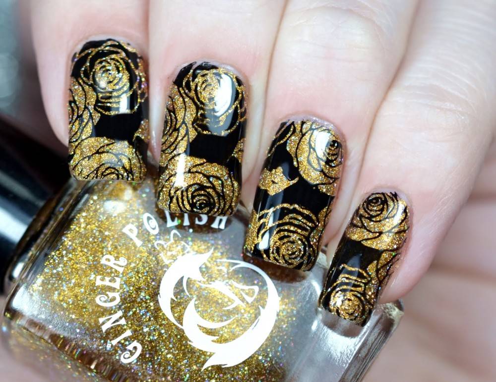 - Для начала выбираем трафарет с изображением розы. Подбираем к нему два контрастных цвета лака или геля. Это могут быть не только классические чёрный и красный, но и розовый и белый, бежевый с золотом и любое другое сочетание.