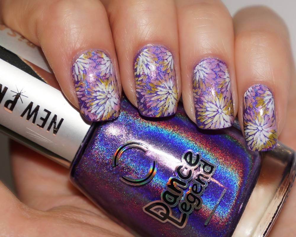 Чтобы получить подобный результат, нужно приложить трафарет к пластине с принтами уже после нанесения на нее лака. Затем прикладывается штамп и выполняются все дальнейшие действия.