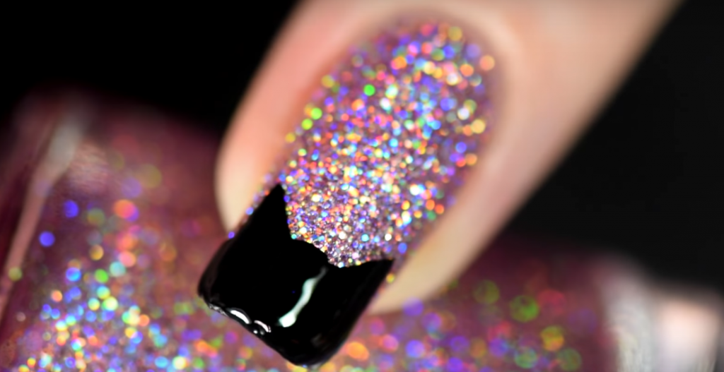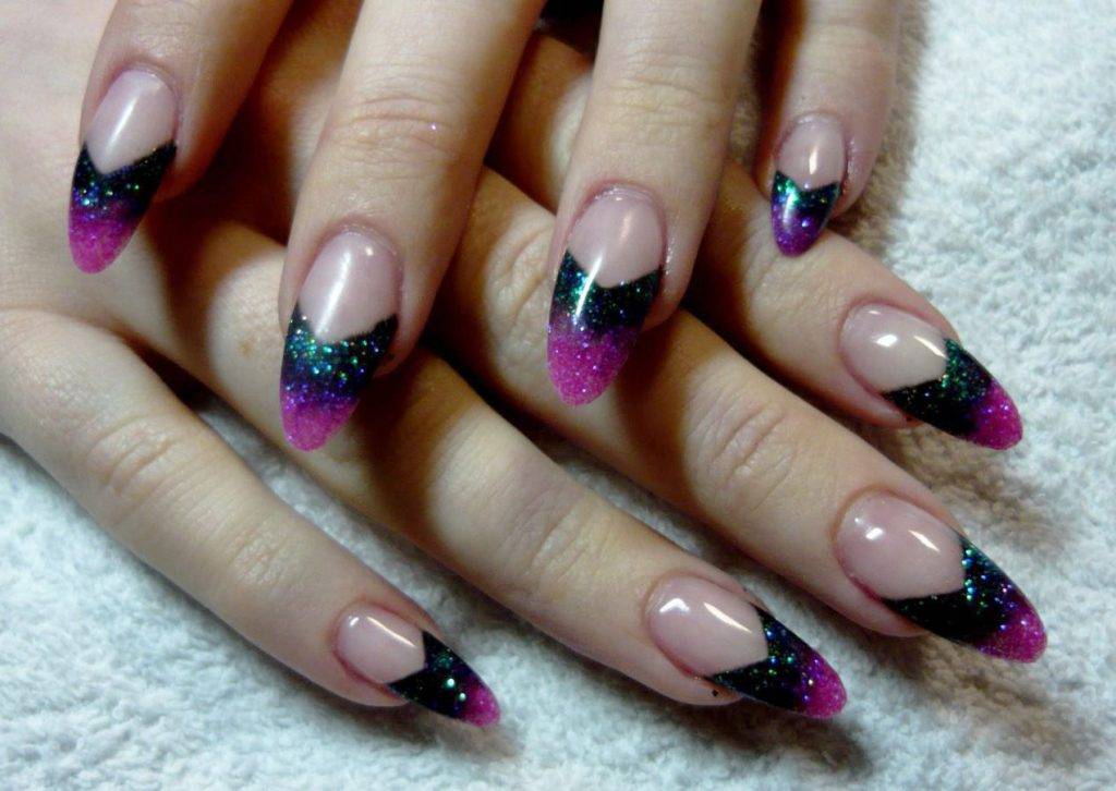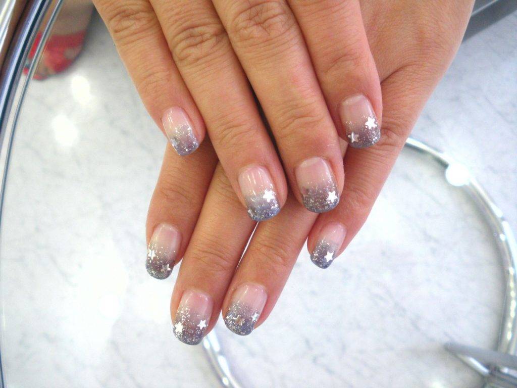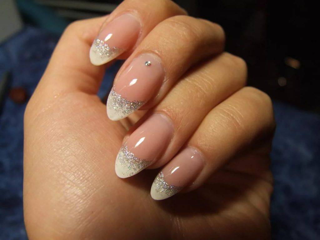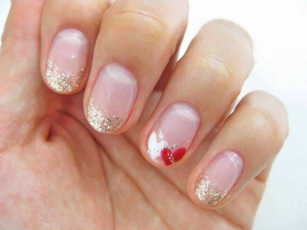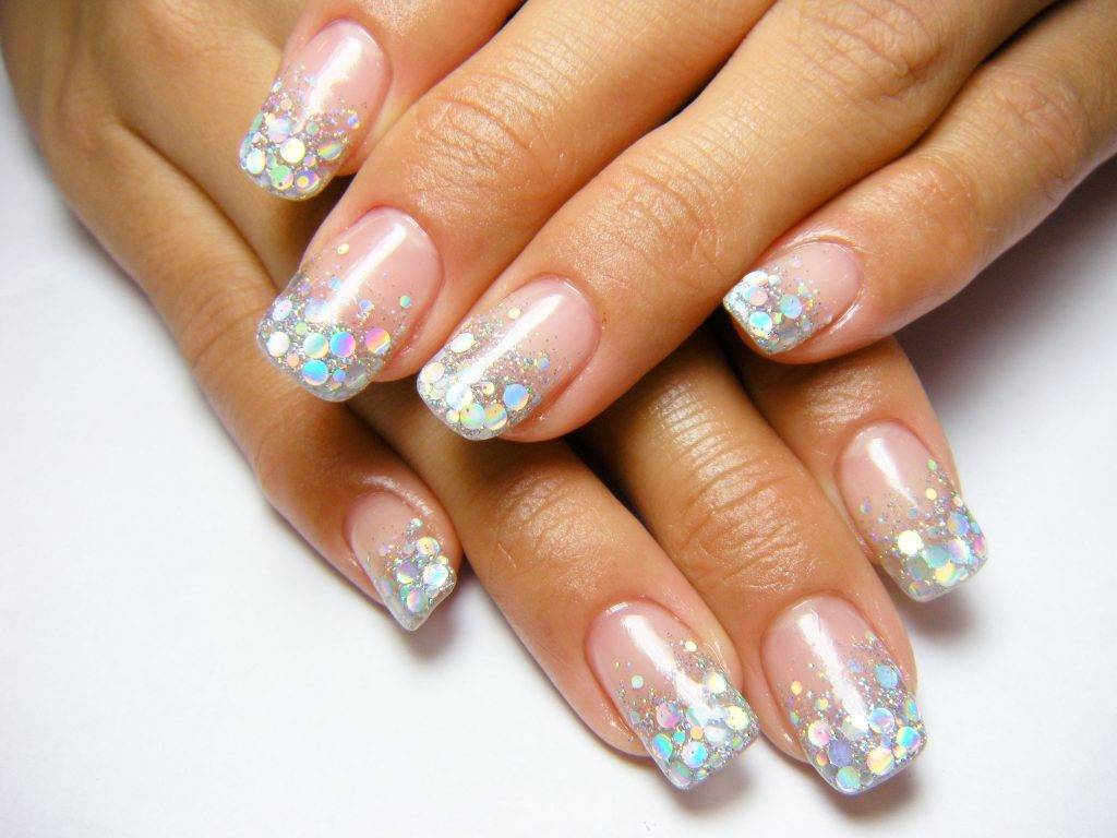Прекрасный вариант для праздничного дизайна. Кончик ногтя можно заполнить плотными блестками или использовать мелкие частички специальной маникюрной пудры. Втирать их можно аппликатором для теней или пальцем.