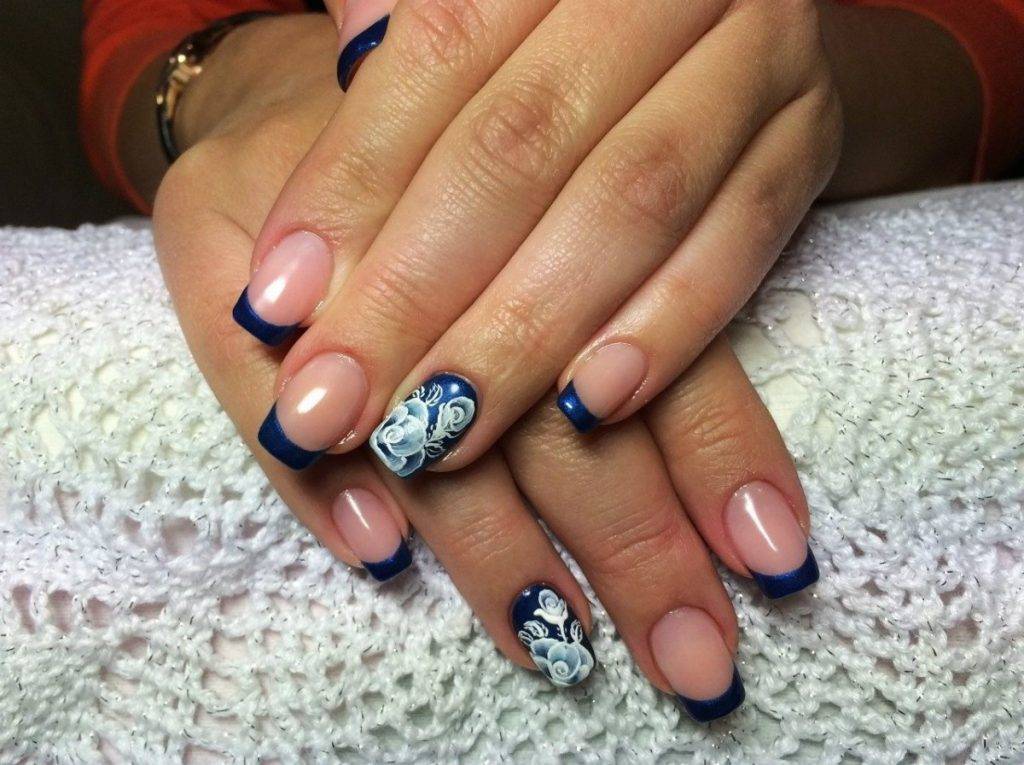- флористика – лучший вариант для оформления френча. Разнообразие цветов огромно, поэтому размещайте на ноготках любые сезонные цветы и другую флористику. Летом это могут быть подсолнухи и ромашки, которые добавят нейл-арту еще большей яркости и контраста, зимой остановите свой выбор на классическом рисунке с розами.