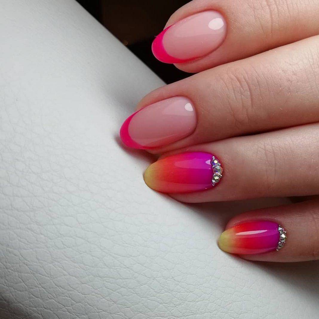 Градиент-френч отличается яркими и сочными красками. Такой дизайн можно сделать с помощью гель лаков или разноцветных гелей. Изящный перекат оттенков прекрасно сочетается с нюдовой камуфляжной подложкой. На каждом ногте можно сделать свой вариант перехода тонов.