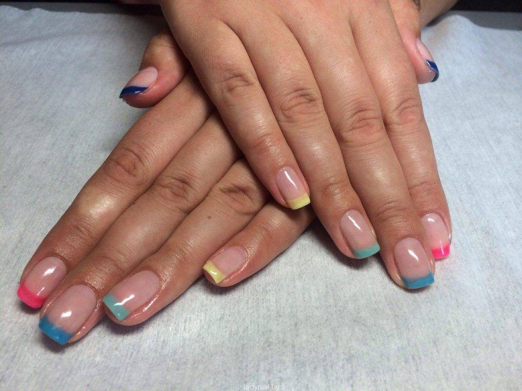 Разноцветный френч всегда выглядит аккуратно и стильно. В зависимости от выбранных оттенков можно использовать технику омбре, добавить в дизайн блестки или стразы, выполнить твист-френч.