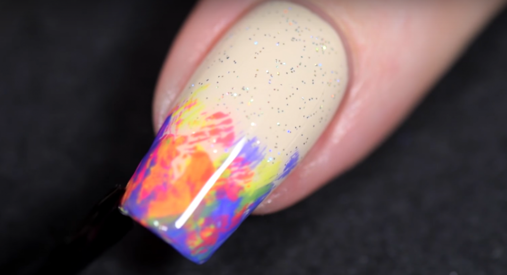 На небольшую пластиковую или картонную пластину нанесите вплотную друг к другу несколько полосок лаков разный цветов (в том порядке, в котором вы их хотите видеть на пальце). Возьмите спонж (или губку), промокните лаки одним движением, а затем быстро перенесите их на палец, тоже одним движением. Спонж на несколько секунд прижмите к ногтевой пластине, затем резко уберите. Повторите процедуру с каждым пальцем, а в завершении покройте ногти закрепителем.