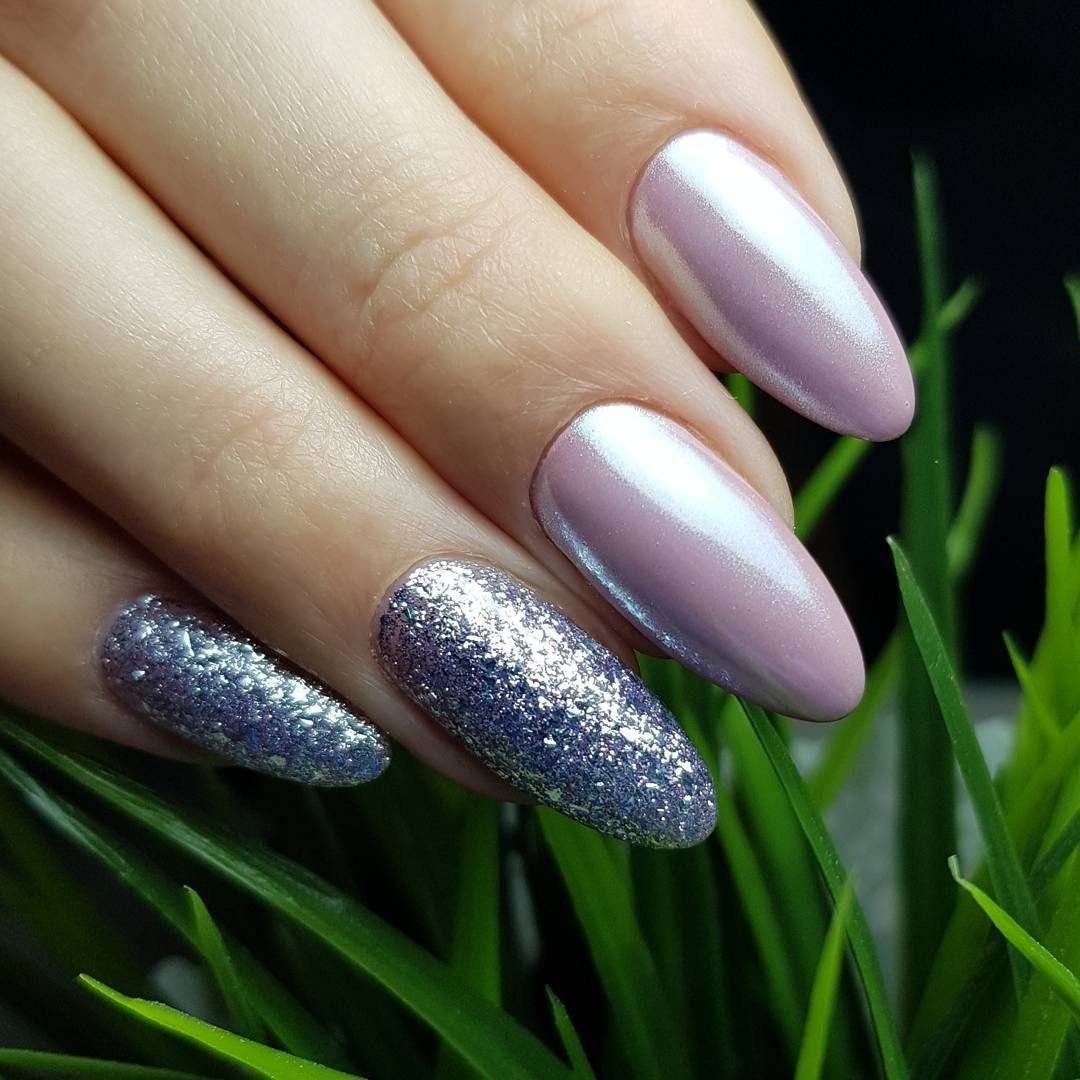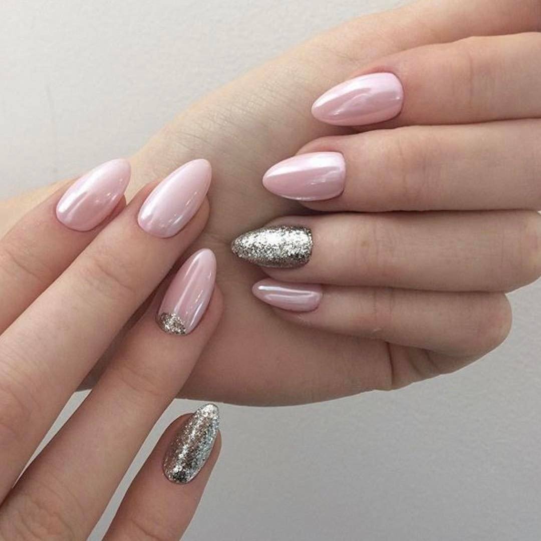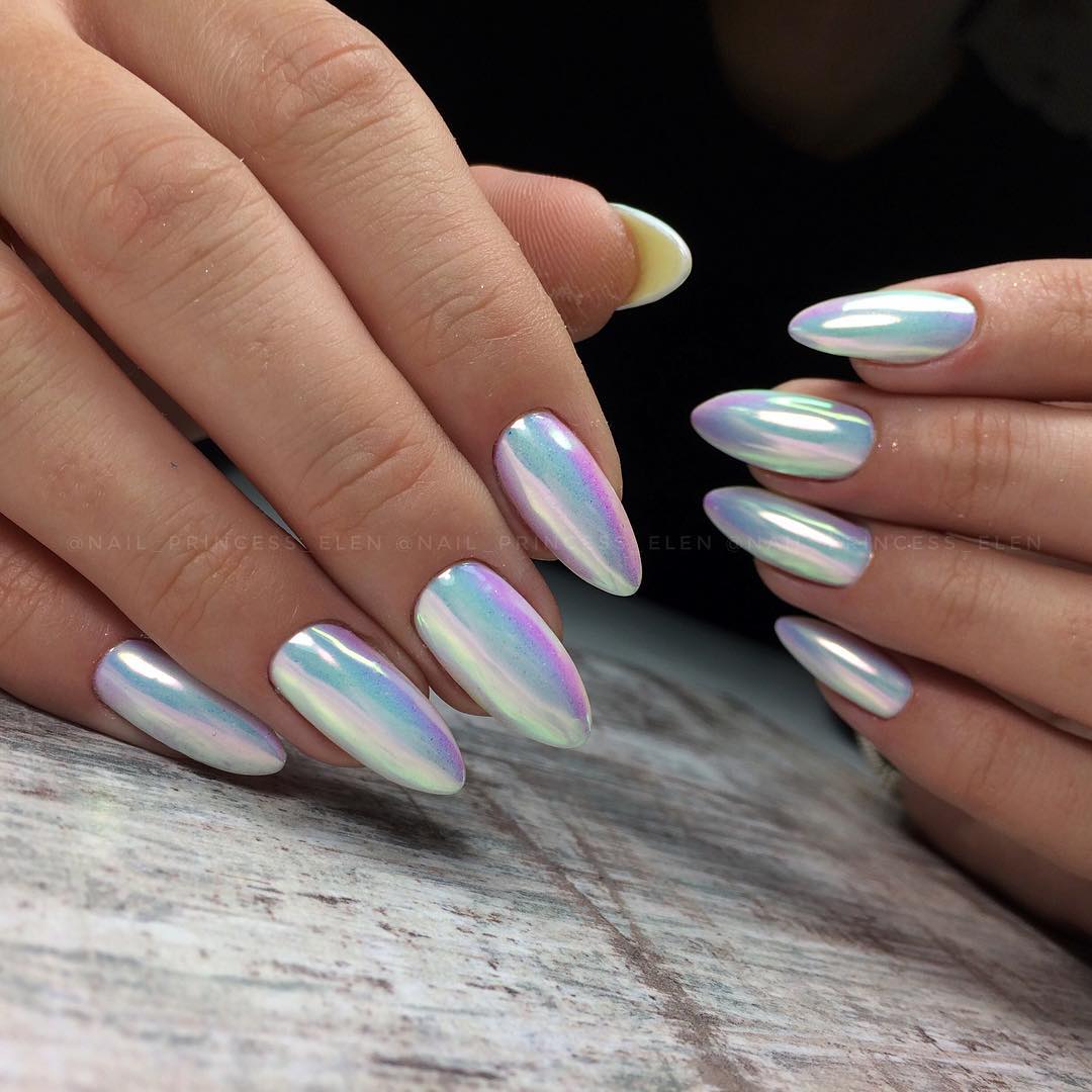 Втирка – тот материал, который великолепно смотрится и без дополнительного декора. Даже однотонный маникюр, выполненный с помощью втирки, смотрится невероятно нежно и благородно. Разновидностей втирки множество: зеркальная, серебряная, голографическая, радужная, жемчужная, жук или панцирь. Несмотря на огромное разнообразие материала, особой популярностью пользуется жемчужная и радужная втирки. Они великолепно смотрятся на светлой поверхности: белой, розовой, голубой.