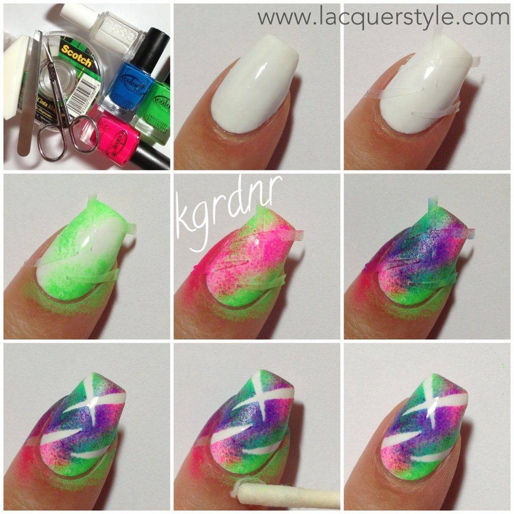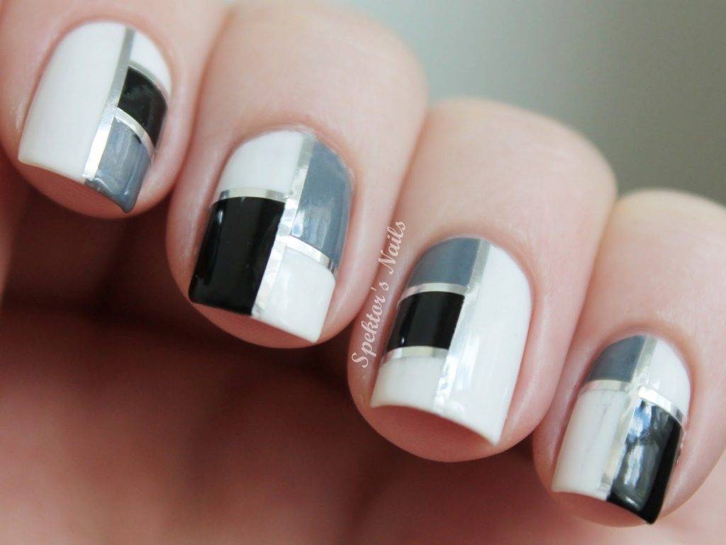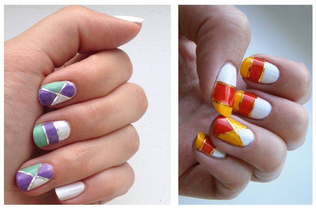 Геометрический узор на ногтях можно легко сделать, используя клеющиеся ленты. Их легко заменить обычным канцелярским скотчем. Самый легкий маникюр, сделанный таким методом – всевозможные полоски и блоки на ногтях. Для начала ногтевая пластина покрывается базовым лаком. После его высыхания, сверху наклеиваются кусочки скотча, а не заклеенная часть выкрашивается другим лаком. Так можно сделать двухцветный маникюр.