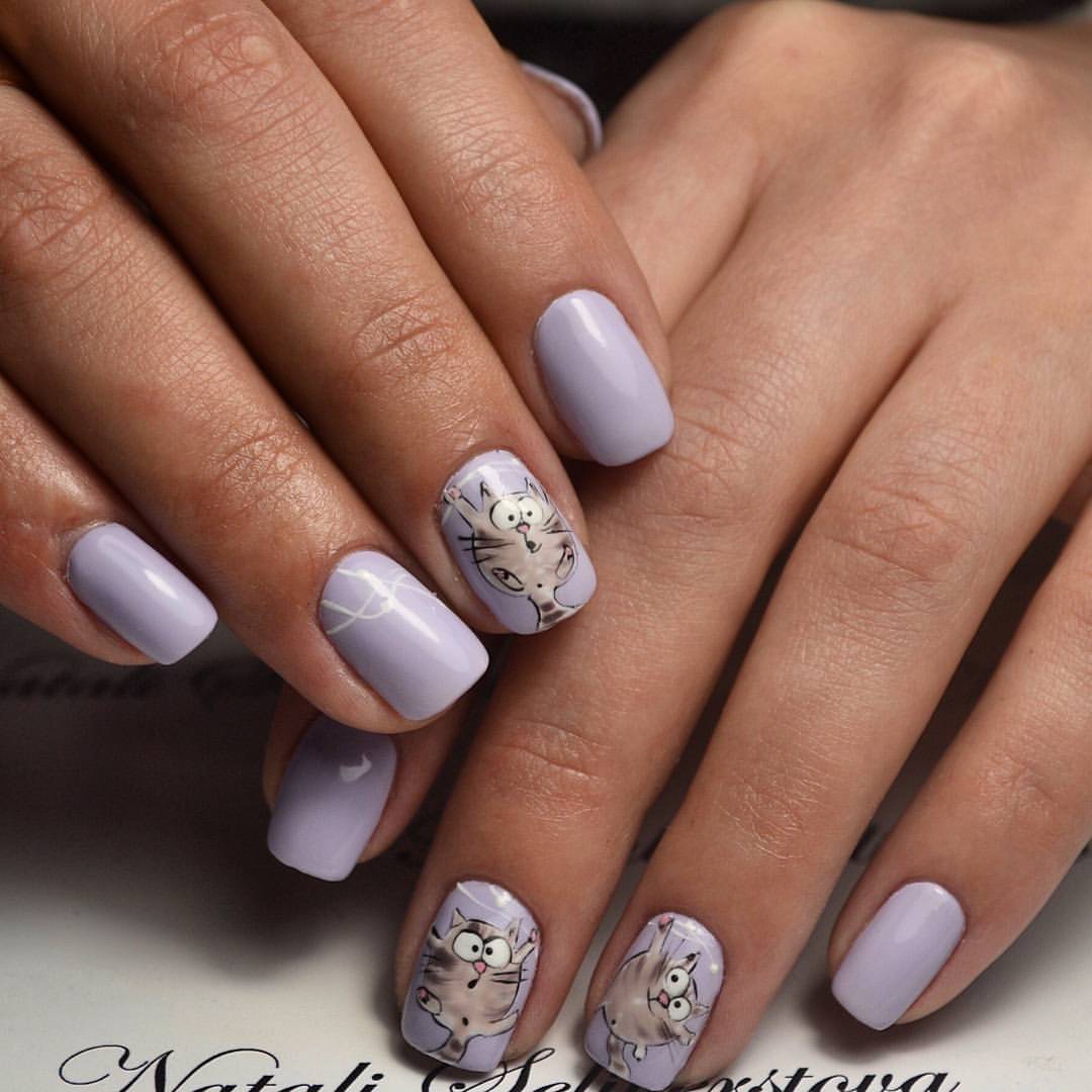 Даже на такой длине можно сделать модный дизайн. Главное – правильно подобрать размер и форму рисунка, декора. В данном случае рекомендуем не делать изображение кошки слишком крупным. Хорошей альтернативой будет ее силуэт, а также мордочки или лапки. Такой дизайн смотрится особенно мило на коротких ноготках.