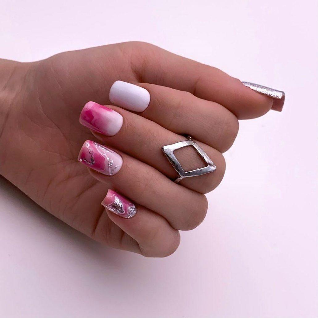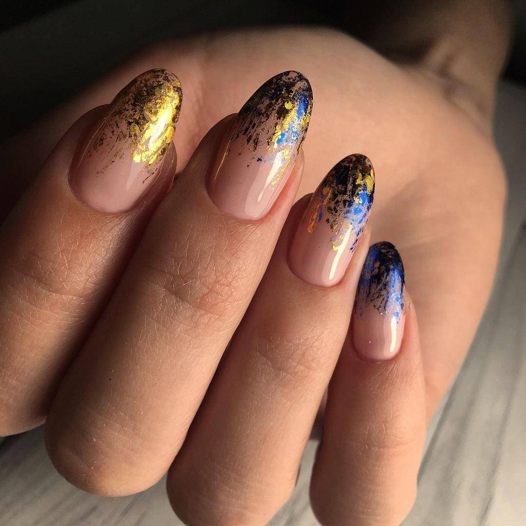 Если ты еще не пробовала создать такой дизайн с разводами, обязательно попробуй. Небольшой совет – смешивай краски на палитре и затем переноси на ноготь кистью для градиента – так получается быстрее.