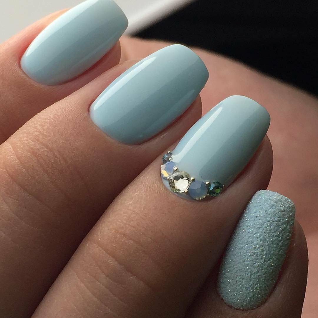 - Дизайн в голубых тонах зимней тематики с применением акриловой пудры смотрится объемно.