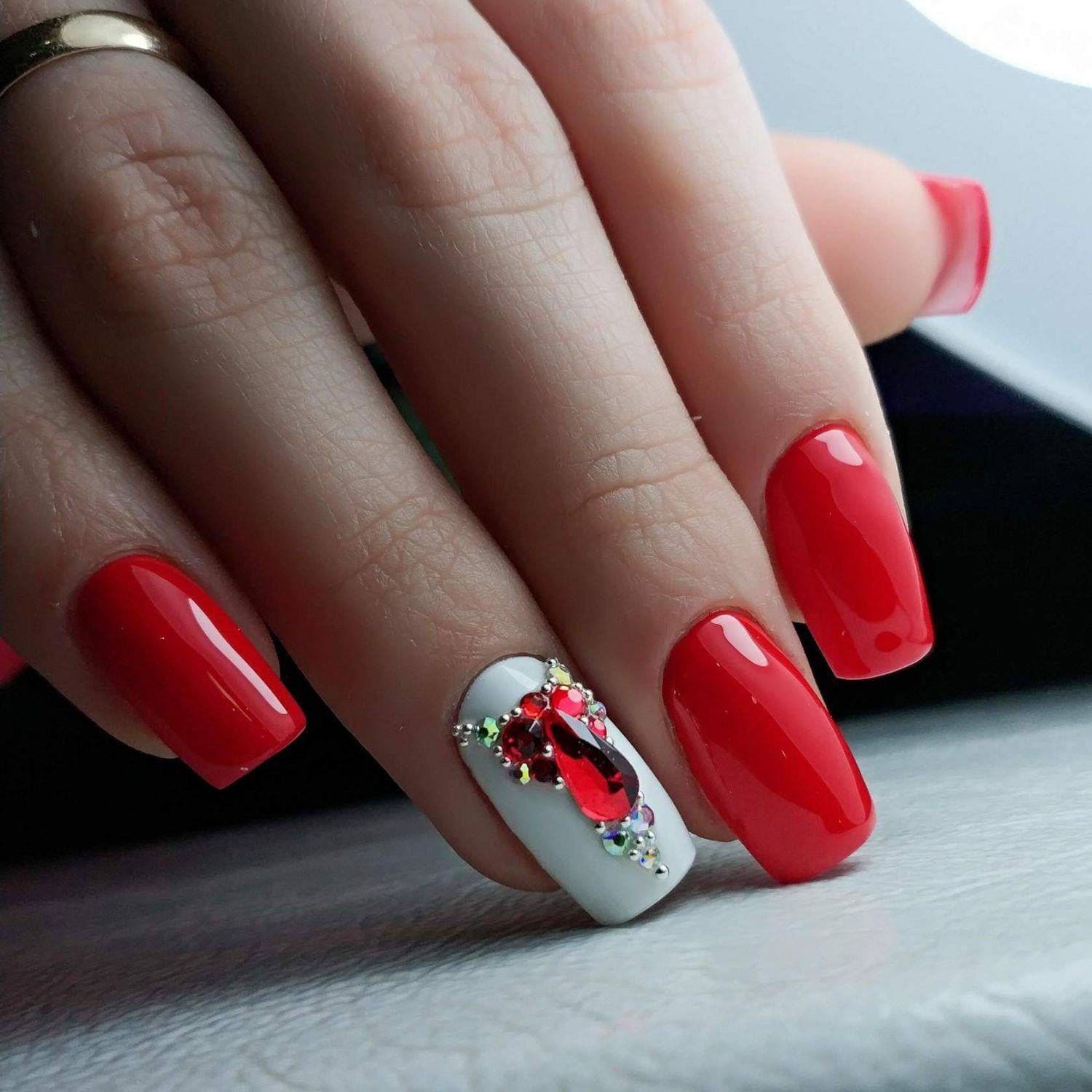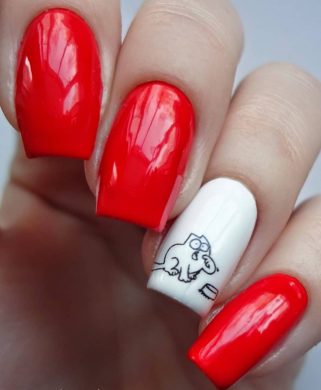 Нейл-арт в контрастных оттенках красного, черного, белого, сразу же привлекает внимание. Такой подойдет смелым и уверенным в себе