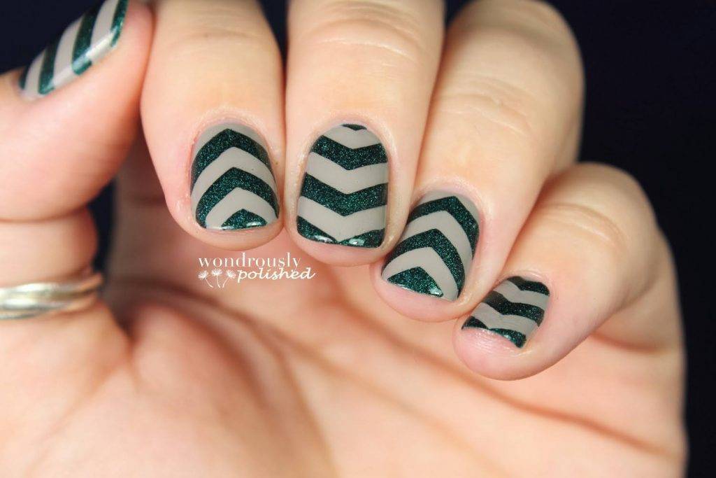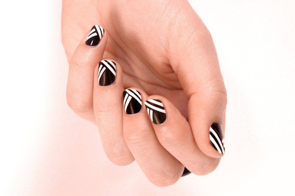 Аналогично на ногтях рисуются полосы и другие геометрические фигуры. Один из самых популярных сегодня маникюров – шахматный, тоже можно сделать, используя скотч, который нарезается небольшими полосками в виде трафарета.