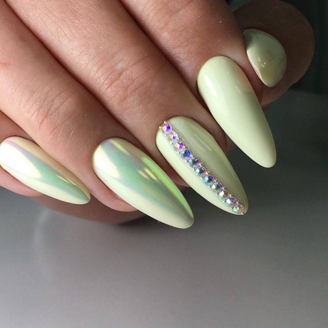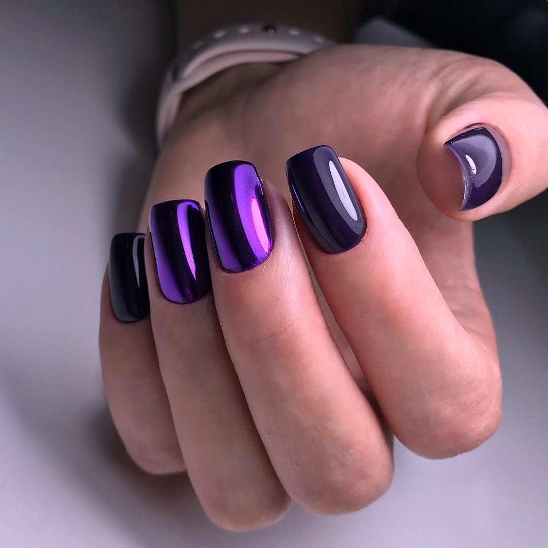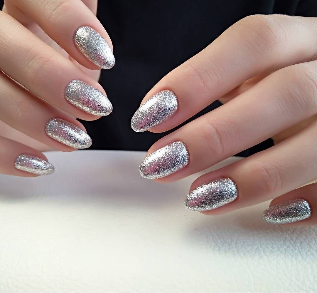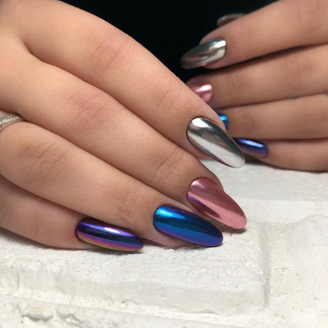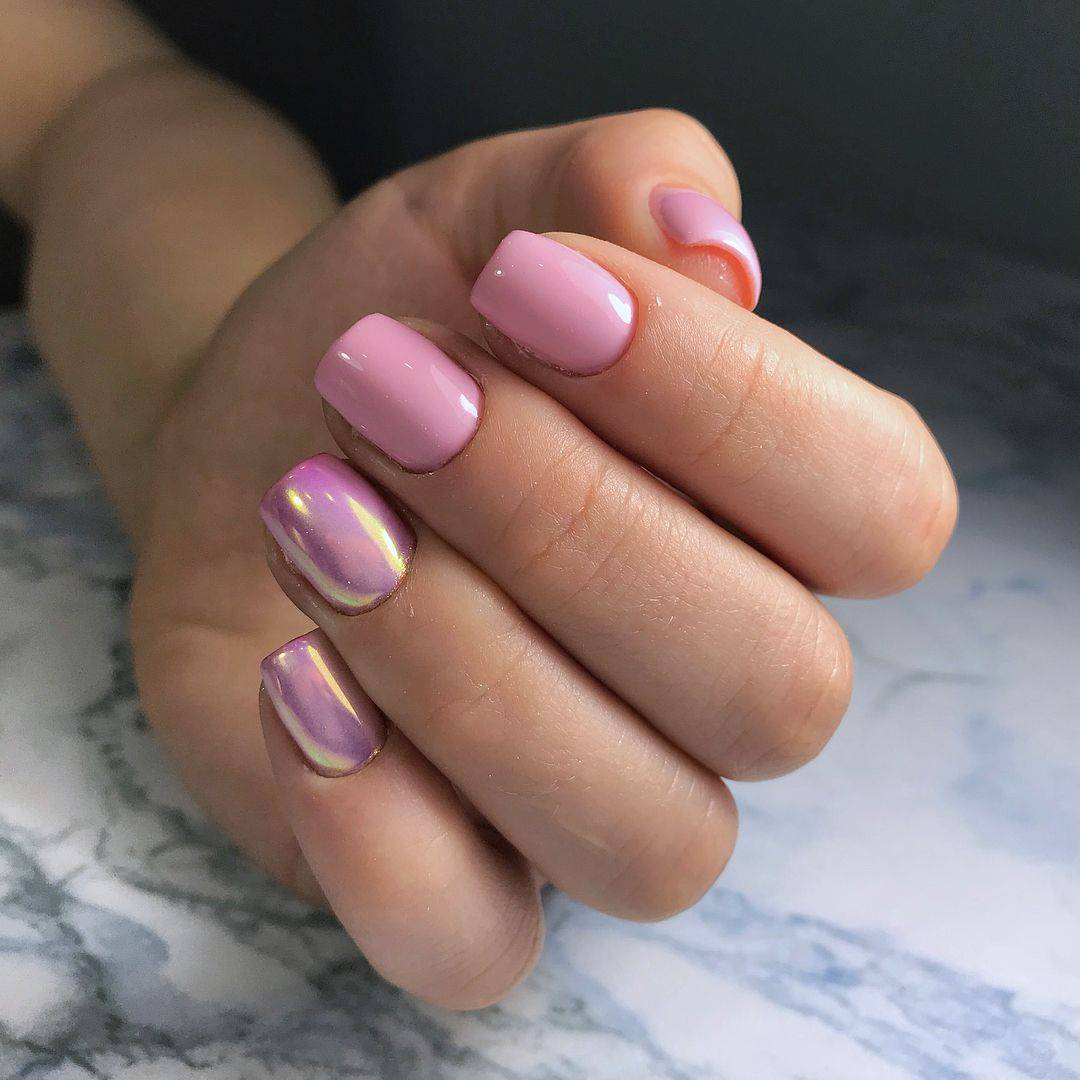 Модный праздничный вариант – зеркальный маникюр или эффект «битое стекло». Они создадут легкое, зажигательное настроение для вечеринки, торжества или фотосессии.