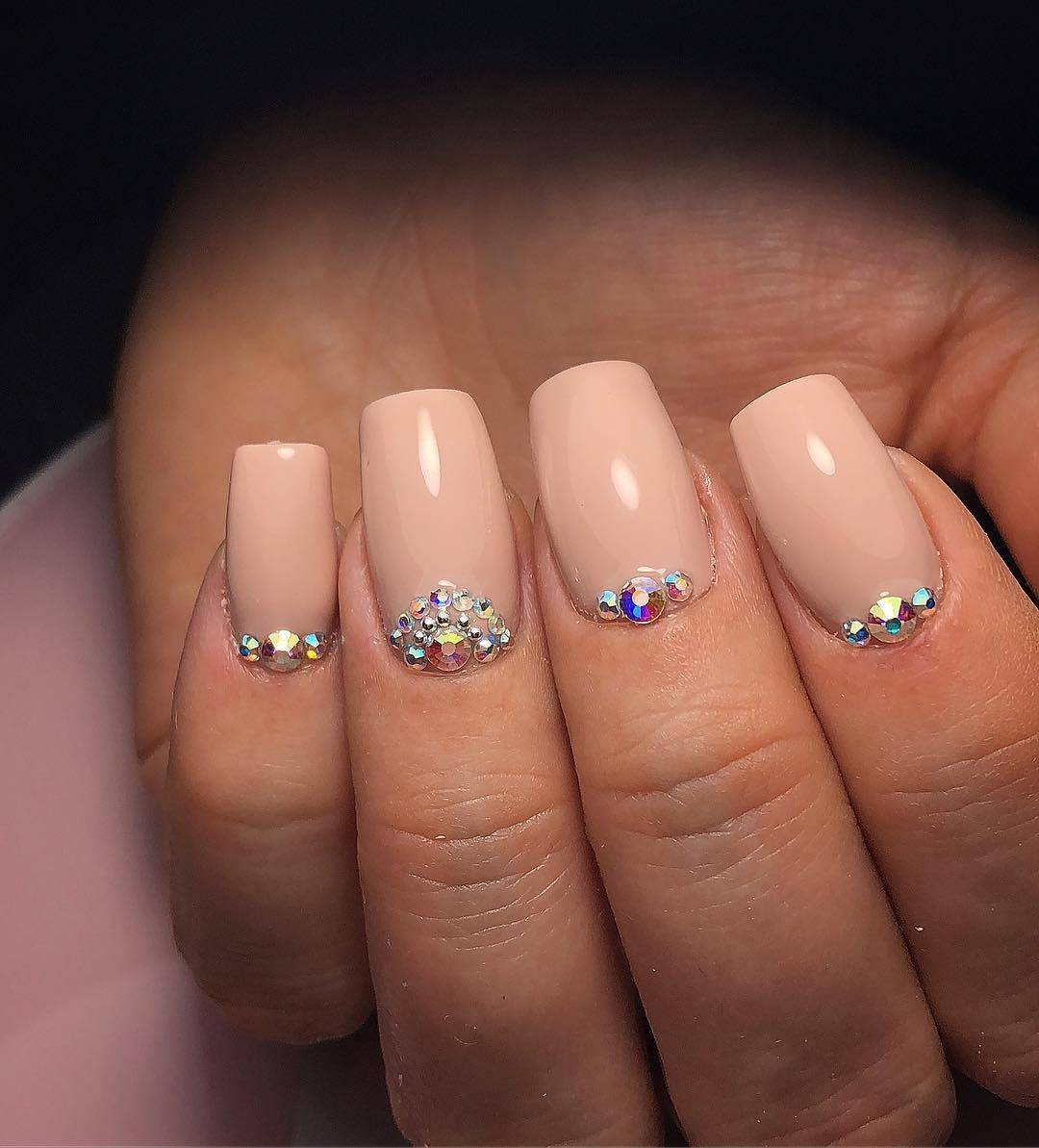 Нюдовый маникюр на короткие ногти в крапинку. Тут тоже придет на помощь штамп для стемпинга – поставь точки гель-краской на палитре и с помощью штампа перенеси на ноготь. Это позволит избежать помарок и исправлений.