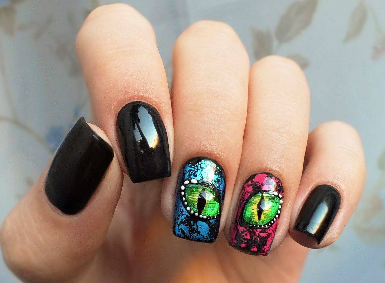 Чтобы передать всю красоту кошачьих глаз лучше располагать дизайн на длинных ногтях. Это поможет не только разместить на них глазки, но и дополнить нейл-арт усиками, абстракцией или другим декором.