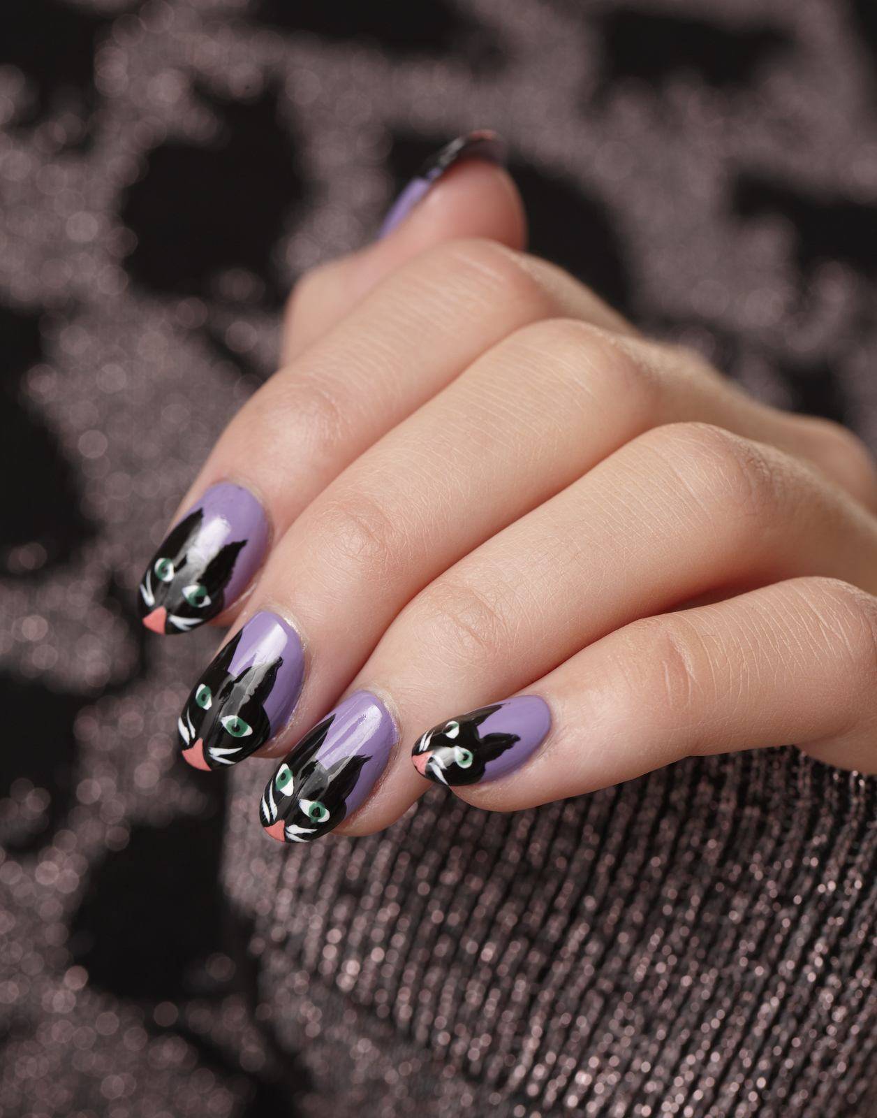Кошачья тематика в маникюре отлично дополнит костюм для Хеллоуина и любой другой вечеринки-маскарада. Тип рисунка должен соответствовать выбранному образу: изящный черный кошачий силуэт и забавная рыжая мордочка – очень разные по настроению и стилю вариации.