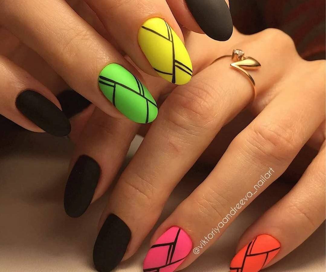 Любители яркого маникюра могут выполнить рисунок с «паутинкой» на сочных оттенках гель-лака. Для красных, розовых, желтых, оранжевых, синих, зеленых покрытий можно использовать черную «паутинку». Сверху ногти можно покрыть матовым финишем, это сделает дизайн еще более стильным.
