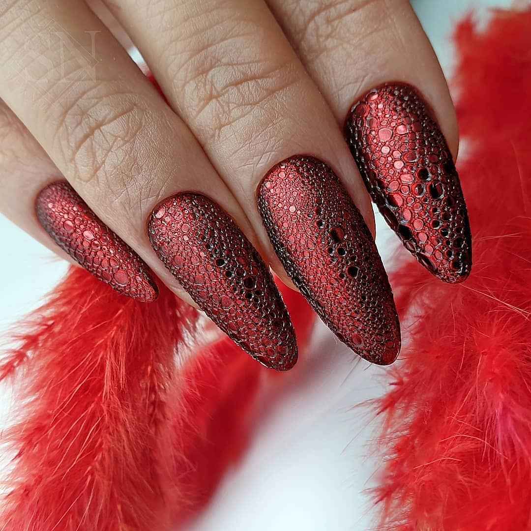 Пенный маникюр готов. При желании можно покрыть ногти глиттером или втиркой. Так дизайн будет визуально похож на кожу рептилии.