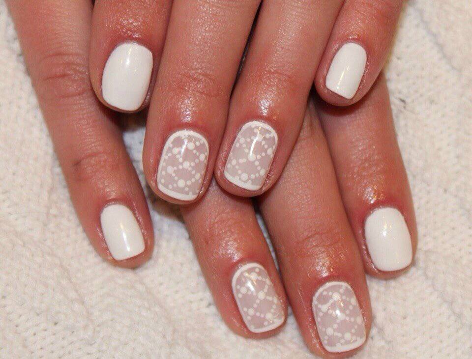 Добавьте на пару ногтей рисунки с кружевом белого цвета. Кстати, маникюр с нюдовым фоном и белой вуалью может подойти и для свадебного образа.